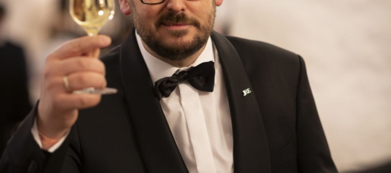 Begleitet wurden die Gänge von einem unterhaltsamen Programm, zu dem auch der Präsident von JRE Europa Daniel Lehmann beitrug: Er überreichte jedem Anwesenden eine Schürze, auf der ein Künstler das Konterfei der betreffenden Person gemalt hatte. In seiner kurzen Ansprache lobte Lehmann das Engagement und die besondere Bedeutung der deutschen Sektion für die internationale Vereinigung. Christian Ottenbacher, der bisher einzige deutsche Präsident auf europäischer Ebene, wurde von ihm als erster Ehrenpräsident in Europa ausgezeichnet. Zum Abschluss des Abends wurden die Hauptpreise der Tombola gezogen: Tim Extra und Maurizio Oster durften sich über eine Reise nach Frankreich zu Laurent Perrier freuen. Die richtige Losnummer bescherte Christian Binder eine Reise nach Parma, die von Parmigiano Reggiano organisiert wird.