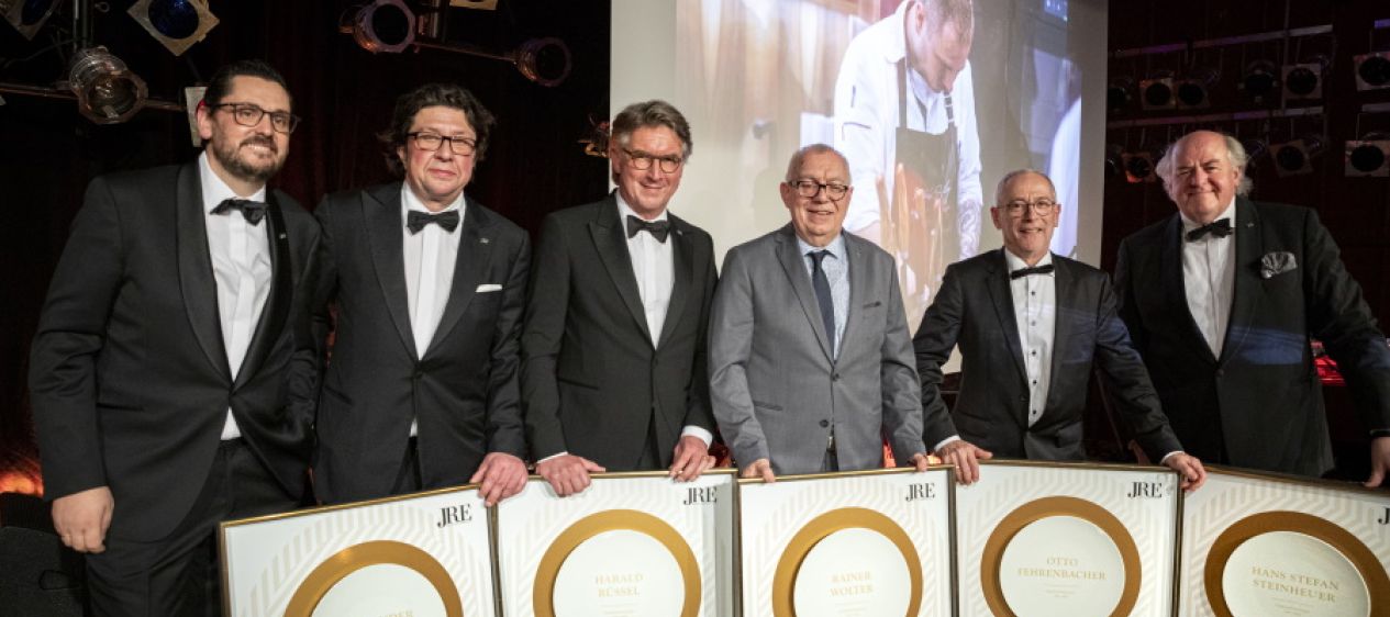 Bei der abendlichen Gala ging der Blick nochmal zurück: Alexander Huber dankte seinen Vorgängern im Amt des JRE-Präsidenten und überreichte den anwesenden Ehrenpräsidenten Rainer Wolter, Otto Fehrenbacher, Hans Stefan Steinheuer, Harald Rüssel und Alexander Dressel eine in Gold gerahmte Urkunde. Moderator Michael Sporer entlockte den Protagonisten in kurzen Gesprächen viel Wissenswertes über drei Jahrzehnte Jeunes Restaurateurs. Im Zentrum des Abends stand auch die Kulinarik: Hausherr Martin Scharff, Björn Swanson, Christian Fleischmann, Michael Ammon sowie die drei Auszubildenden Konstantin Schulze, Zanda Mierkalne und Lara Panero von der JRE Genuss-Akademie kochten das 5-Gänge-Jubiläumsmenü.