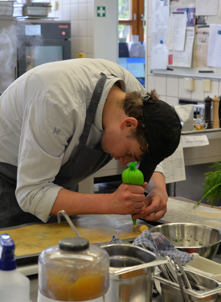 Bei der Prüfung wurden die Auszubildenden zunächst in Zweierteams eingeteilt, wobei jeweils eine Person ein Fischgericht mit Spargel und die andere Person ein Dessert mit Ahornsirup ausarbeiten sollte. Die Zutaten dafür kamen von den JRE Partnern R express, Deutsche See und Ahornsirup Kanada. Beide Gerichte sollten dann in Teamarbeit zubereitet werden. „Bewertet wurden Kreativität, Teamarbeit, Präsentation und Geschmack sowohl Team- als auch als Einzelleistung “, erklärt Maerz.