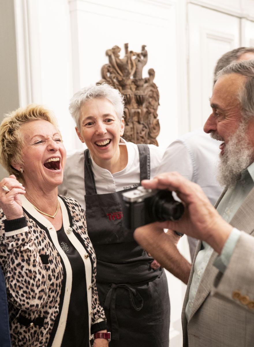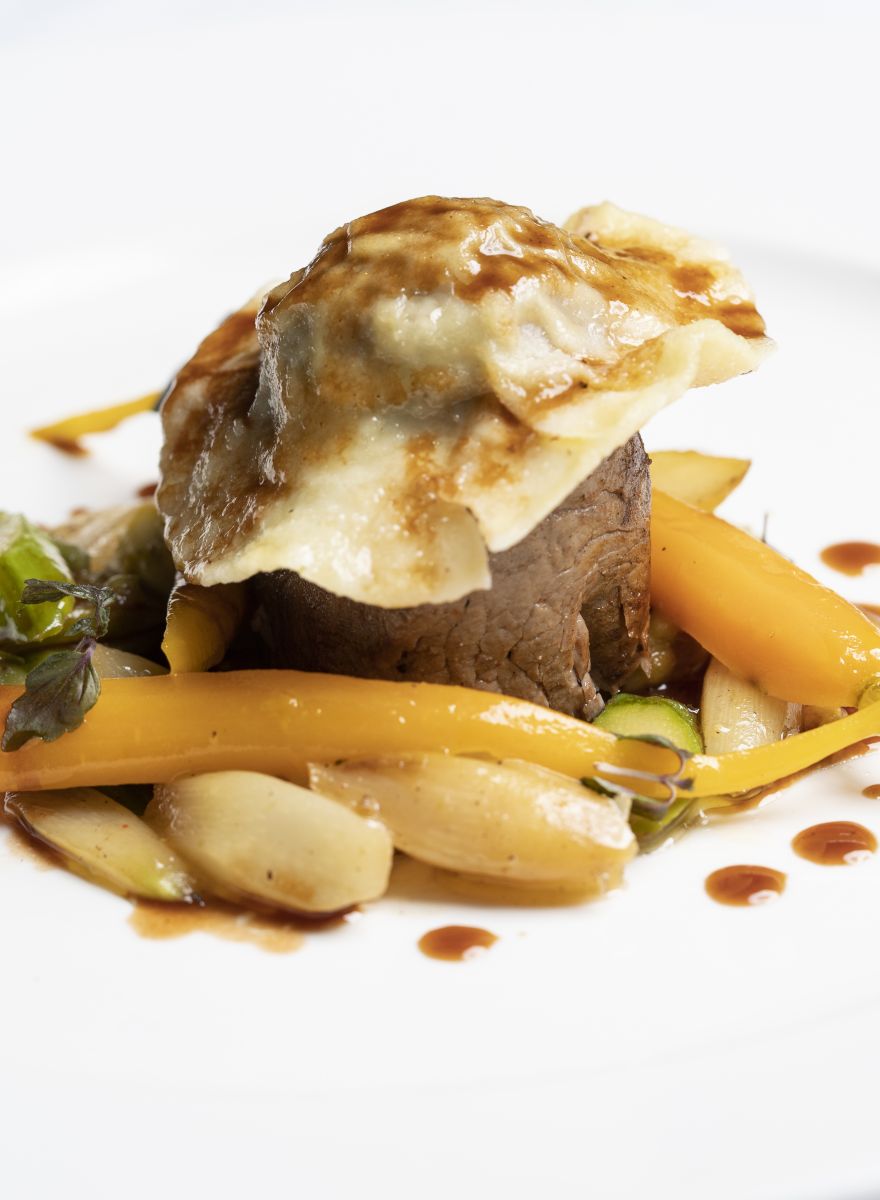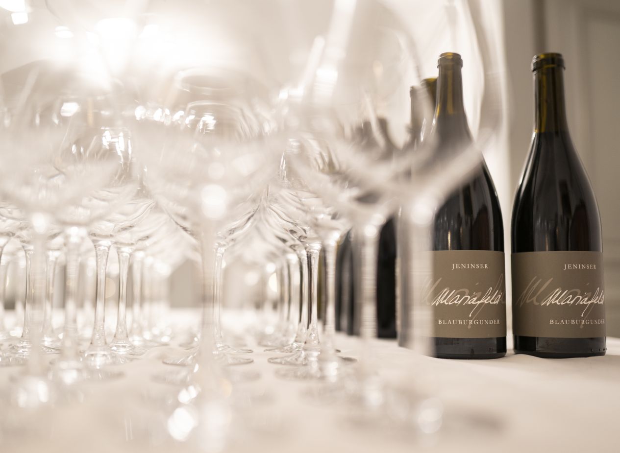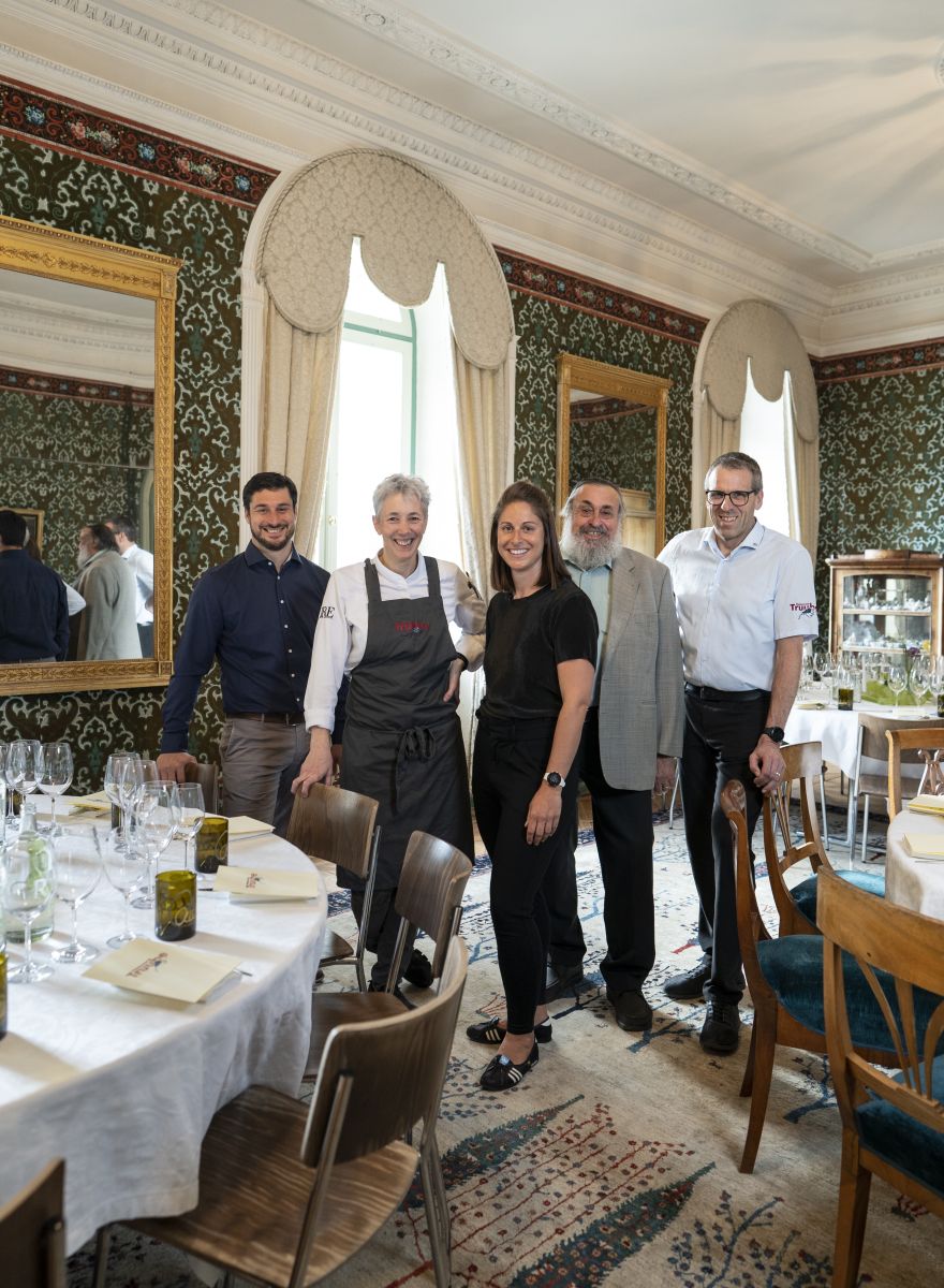 Die andere Hauptdarstellerin des Abends: Die Familie von Tscharner, vertreten durch Gian-Battista, Johann-Baptista und Francesca. Selbstverständlich gab es an diesem Abend nur Weine vom Schlossgut. Konkret: Jeninser Pinot Gris 2022 zu Spargelmousse, Morchel, Kirschlachs und Kresse. Sauvignon blanc «Goldrush» zu Schweizer Zander, Erbsen, Spargeln und Kaffirlimetten. «Churer Spotläs» zum Dessert (pochiertem Rhabarber, Spargel, weisser Schokolade und Pistazien). Zum Hauptgang wurden gleich zwei von Tscharner Weinen kredenzt: Jeninser Blauburgunder «Mariafeld», in den beiden Jahrgängen 2011 und 2018. Silvia Mansers Kreation dazu: Kalbsfilet und Raviolo, Spargeln, Karotten und Frühlingszwiebel. Die von Tscharners sind immer für gereifte Jahrgänge eingestanden. Nicht umsonst sind sie engagierte Mitglieder der Vereinigung «Mémoire des Vins Suisses», die Schweizer Weine der renommiertesten Güter archiviert.
