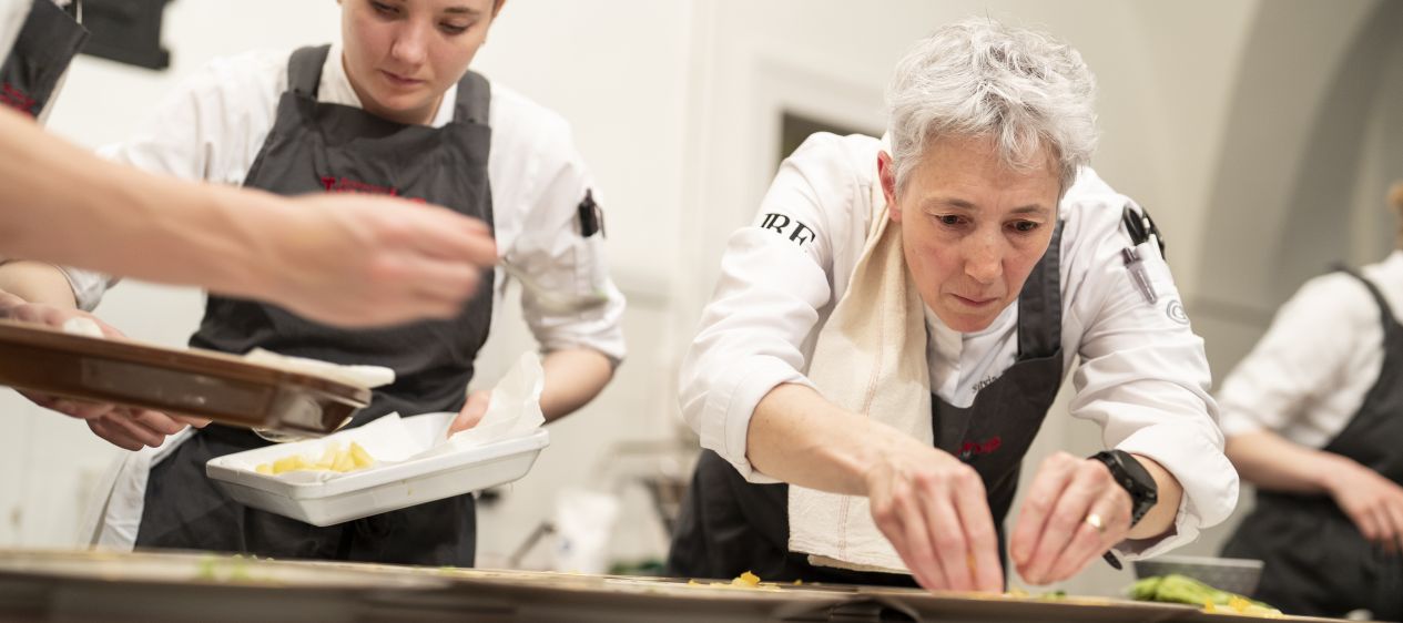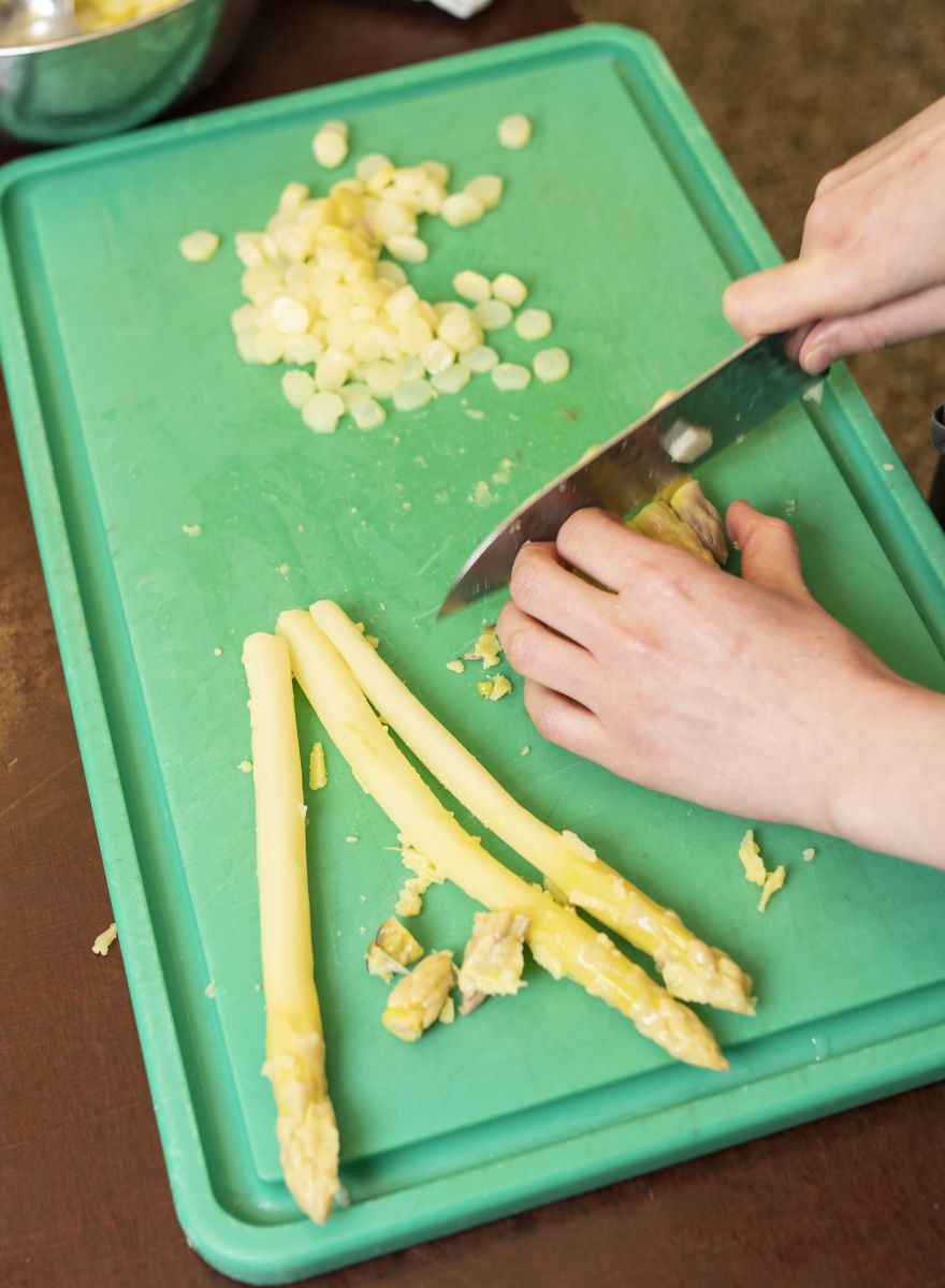 Die Reichenauer Spargeln sind nicht wie ihre Artgenossen. Von Tscharners kultivieren sie nämlich nicht wie gewohnt in Erdhügeln, sondern lassen sie aus dem ebenen Boden wachsen. Gedeckt werden sie mit Tunnels aus schwarzer Folie. Zum Ernten genügt ein einfaches Küchenmesser. Ihr Anblick ist ungewohnt: Sie sind weiss, aber ihre Kopfform gleicht eher jener von grünen Spargeln. «Die Reichenauer Spargeln sind etwas Besonderes. Sie unterscheiden sich von den Diepoldsauern, die ich sonst meist verwende. Man muss sie deutlich weniger lang kochen. Man kann sie sogar roh essen.» Das sagt Silvia Manser, die mit 17 GaultMillau-Punkten ausgezeichnete Chefin der «Truube» Gais. Sie sorgte für die kulinarische Seite des Anlasses, unterstützt von ihrem Mann Thomas und dem Küchenteam. Silvia, Mitglied bei den Jeunes Restaurateurs: «Ich freue mich im Frühling immer sehr auf die Spargeln. Sie sind Frühlingsboten. Ein feines, sanftes Gemüse.»