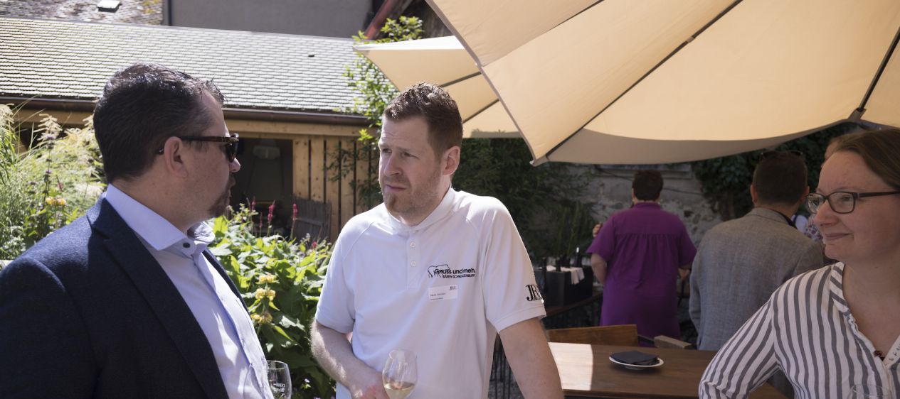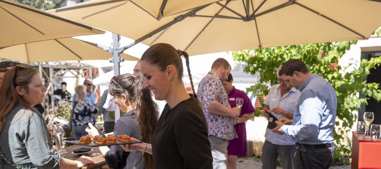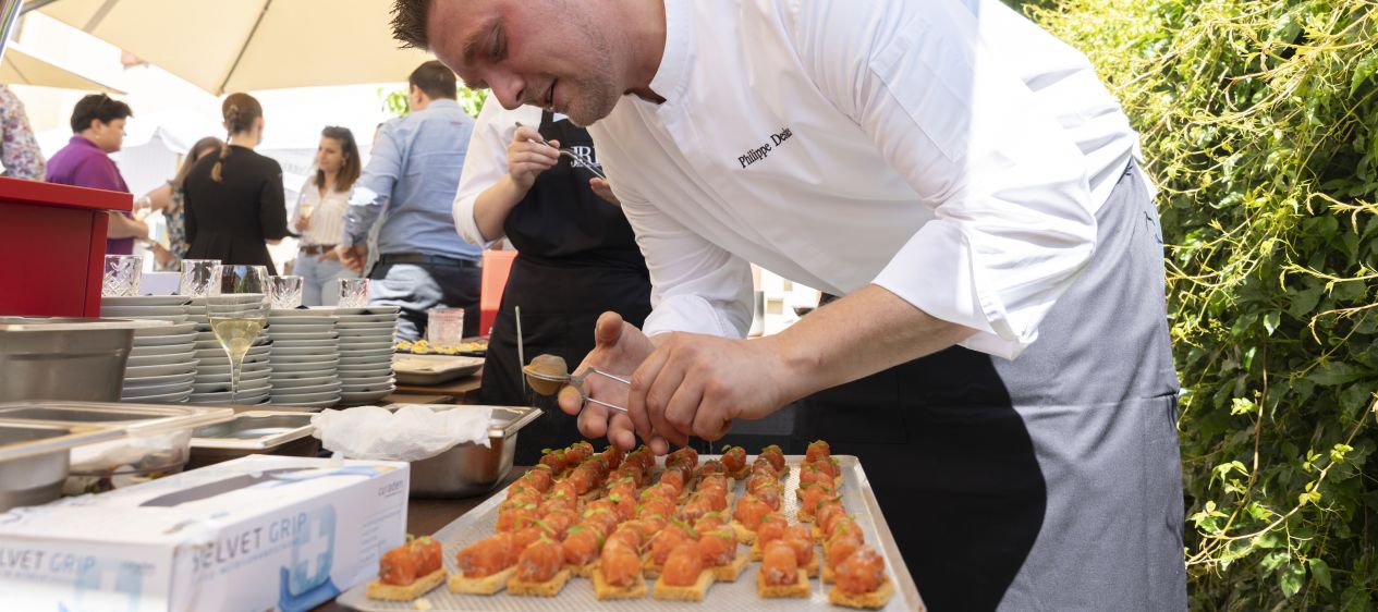SONNIGES ESSEN UND FREUNDE. Die rund 60 Gäste liessen es sich im wunderschönen Garten des Restaurants gut gehen. Philippe Deslarzes lächelt: «Seit einer Woche studieren wir ständig die Wetterprognosen. Heute Morgen waren wir noch nicht sehr zuversichtlich!» Glücklicherweise zeigte sich der Himmel dann doch strahlend blau, und die Sonne kam hervor. Als sonnig konnte man auch die Tartelettes mit Kalb, Tannenknospen und Kartoffelheu umschreiben, die das Duo vom «Les Touristes» zubereitet hatte. Die beiden Köche wurden infolge auch von Olivier Vallotton, einem der Gründungsmitglieder der JRE Schweiz, bei der Übergabe gelobt: «Martigny hat viele Persönlichkeiten hervorgebracht, Pascal Couchepin oder Christian Constantin. Und wir sind stolz darauf, auch Sie zwei in dieser schönen Stadt zu haben.»