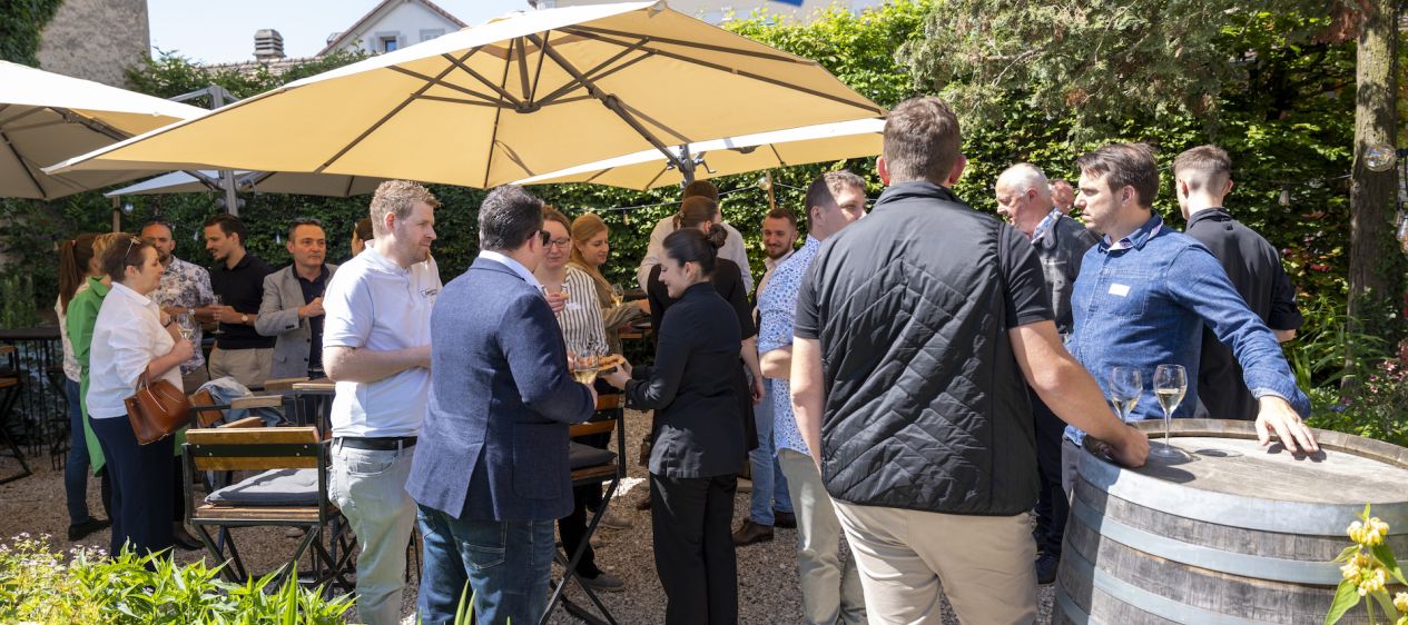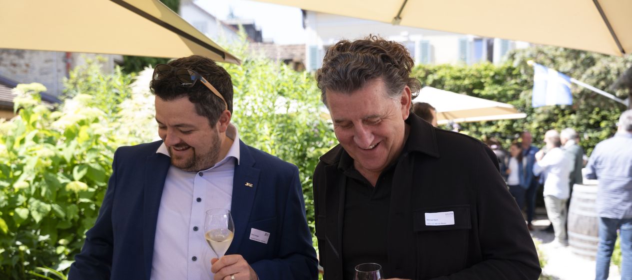 «WELCOME» AUCH FÜR EIN JRE-BABY. Die Plaketten für die neuen Mitglieder verteilten JRE-Schweiz-Präsident Denis Schmitt (»Le Murenberg», Bubendorf BL, 16 Punkte) und Olivier Hiernard («La Croix d'Or», Yens VD, 15 Punkte). Sie liessen es sich nicht nehmen, dem neugeborenen Kind von Fiona und Christian Aeby («Du Bourg», Biel, 17 Punkte) ein kleines Geschenk zu überreichen. Schmitt fügte an, wie viel Freude es ihm bereite, seit einem Jahr die JRE in der Schweiz zu leiten. «Ich schätze die Werte, die wir teilen.» Den Worten lauschten etwas abseits auch Patrick Germann («Bären», Schwarzenburg BE, 15 Punkte), Beat Stofer («Balm», Meggen LU, 16 Punkte) und Martin Thommen («Bären», Utzenstorf BE, 15 Punkte) im Schatten der Sonnenschirme. Diesmal seien vergleichsweise wenige Köche aus der Deutschschweiz anwesend, meinte Denis Schmitt weiter, da Aubonne ziemlich im Westen liege. «Aber es ist schön zu sehen, dass alle miteinander diskutieren!» Wie gesagt, ein Nachmittag im Zeichen des Austauschs und der Freundschaft.