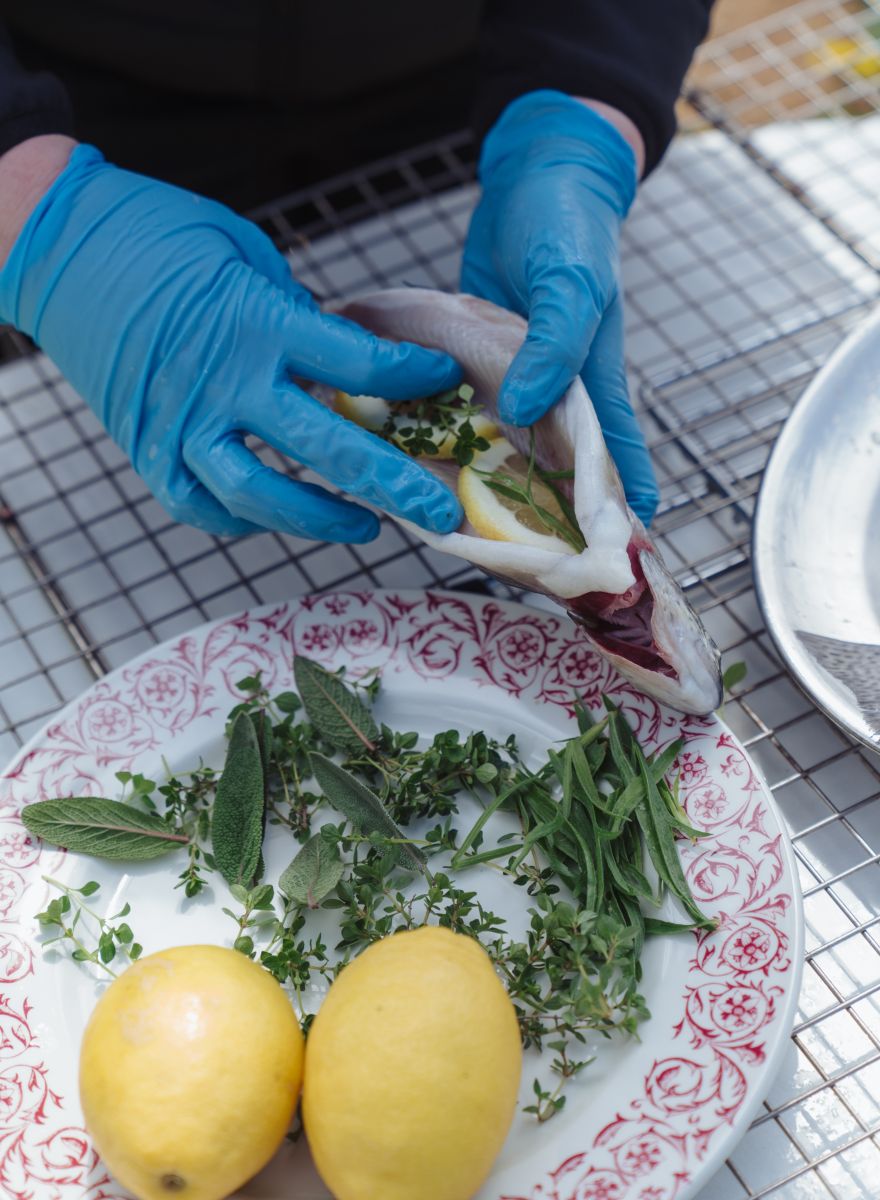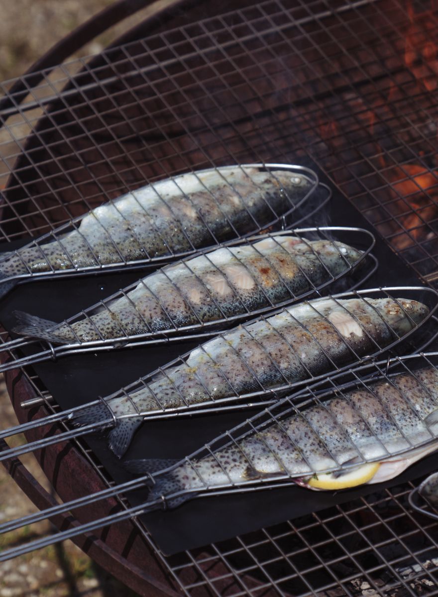 EXKLUSIV IM «BÄREN». Die Casinis produzieren nicht die grosse Masse. Der grösste Teil der Fische geht an Privatkunden. Kaufen kann man die Fische auch auf dem Markt in Schwarzenburg oder tiefgefroren im Bioladen Birena. Der «Bären» ist das einzige Restaurant, das in den Genuss der Regenbogenforellen kommt. «Für uns war klar, dass wir den Bären beliefern wollen. Ihr macht das so toll», schwärmt Priti. Doch an diesem Tag kocht der Jeune Restaurateur-Chef nicht in der eigenen Küche. Zusammen mit Souschefin Carmen Pose grilliert er die Forellen über dem Feuer auf dem Hof. Viel braucht es dafür nicht: Der Bauch der Fische wird mit Kräutern und Zitrone gefüllt und mit etwas Olivenöl beträufelt. Nach dem Grillieren, braucht es noch etwas Salz. «Wenn man sieht, wie die Forellen hier produziert werden, kann ich auch zu 100 Prozent hinter dem Produkt stehen», sagt Germann.