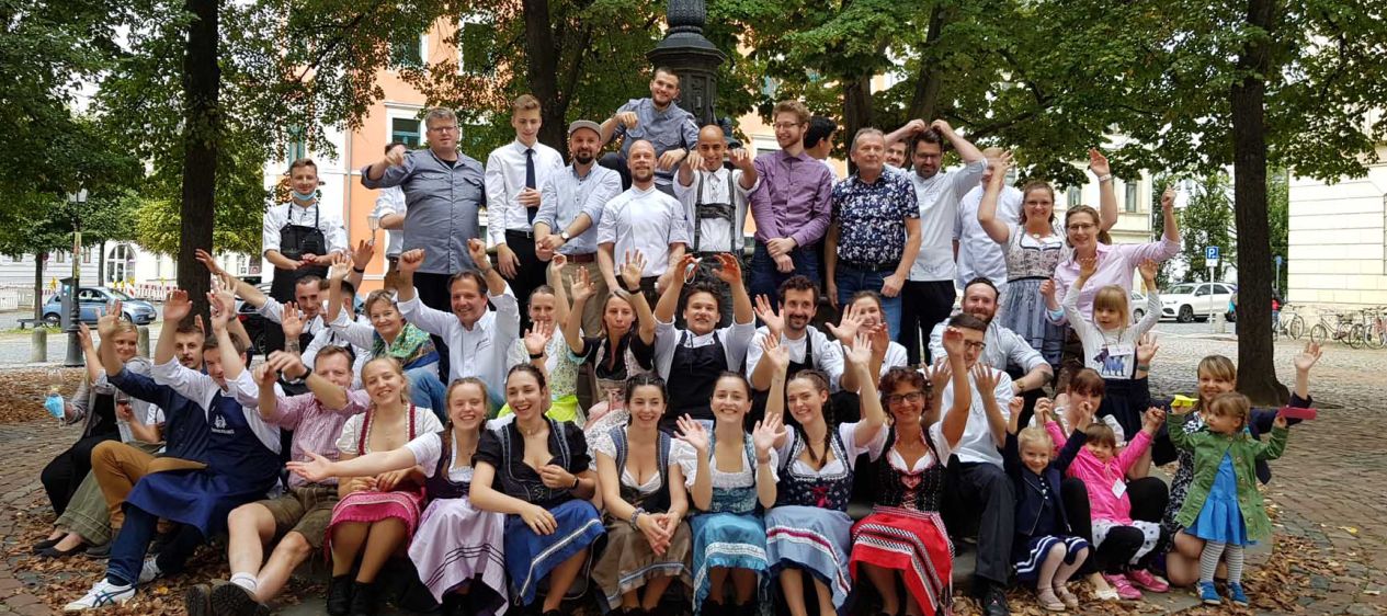 „Foto: Zum Erntedankfest begrüßt das Team des Bülow Palais‘ seine Gäste traditionell in Lederhose und Dirndl (c) Hotel Bülow Palais“