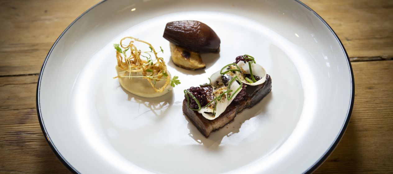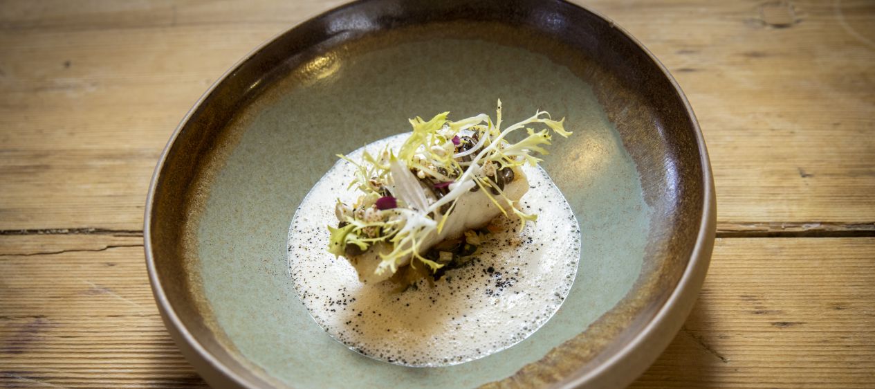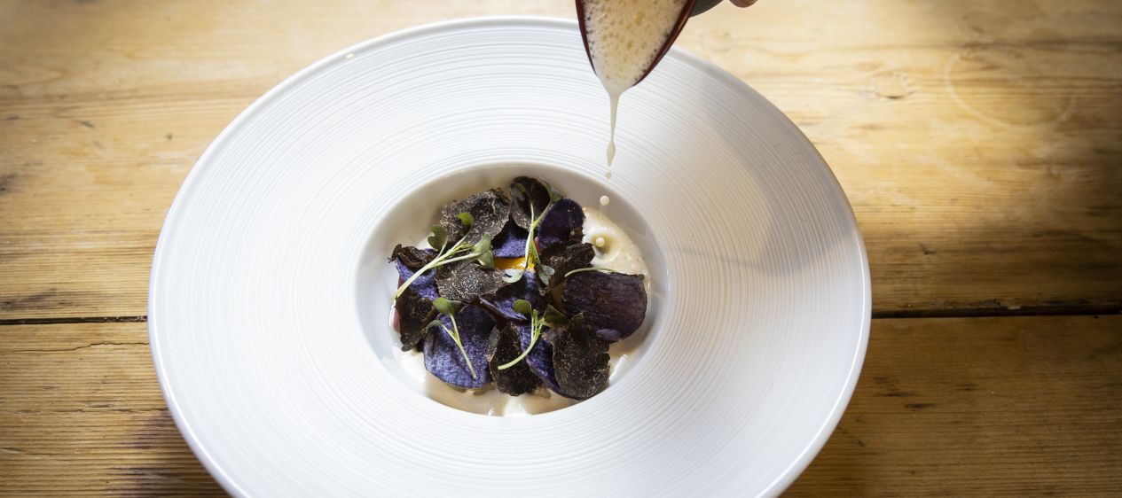 4 SORTEN BERGKARTOFFELN. Während die Männer in der Küche walten, sorgen Marianne Inniger und Tamara Bader draussen für den perfekten Service. Die nächsten Gänge müssen serviert werden: Der warm geräucherte Lachs auf Belugalinsen mit Currysauce von Stefan Bader hat eine feine Schärfe. Inniger packt vier Sorten der Albula-Bergkartoffel auf den Teller. Als Chips, als Püree und im Butter konfiert. «Letzteres ist die Luxus-Variante von Gschwellti», sagt Inniger. Unter einer Schicht Perigord-Trüffel versteckt sich noch ein temperiertes Eigelb. Ein Teller, den man gerne bis zum letzten Bisschen auslöffelt.