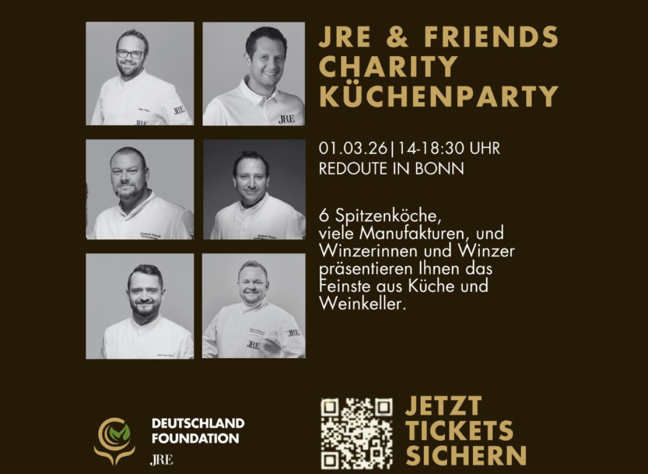 Am 01. März 2026 verwandelt sich die geschichtsträchtige „La Redoute" in Bonn erneut in ein Paradies für Genießerinnen und Genießer: Die JRE-Deutschland laden zur dritten JRE & Friends Charity Küchenparty ein – einem kulinarischen Highlight, das Genuss und gesellschaftliches Engagement vereint. Spitzenköche der Vereinigung, renommierte Winzerinnen und Winzer sowie ausgewählte Partner sorgen für ein außergewöhnliches Erlebnis, bei dem Gäste einen außergewöhnlichen kulinarischen Sonntag in besonderer Atmosphäre verbringen und dabei Gutes tun können. Der Reinerlös der Veranstaltung fließt direkt in Projekte der JRE-Deutschland Foundation, die sich für mehr Ernährungsbewusstsein bei Kindern und Jugendlichen einsetzt.
