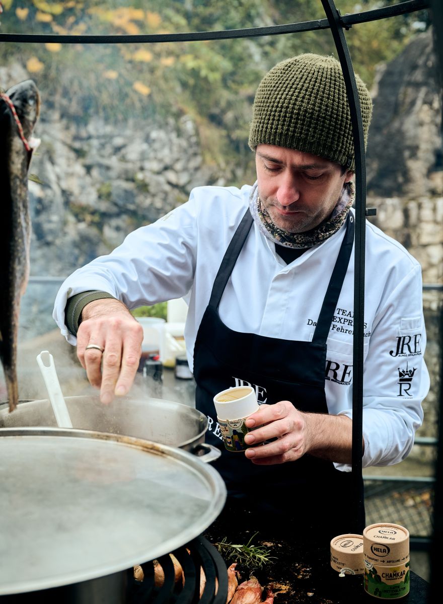 Der Sonntag begann mit einem ersten Höhepunkt: Auf der Burgruine oberhalb der Blauen Burg wurden die Teams und ihre Gänge ausgelost. So kochten Benjamin Unger („Blauer Engel“, Aue-Bad Schlema) gemeinsam mit Content Creator und „Brotsommelier“ Axel Schmitt (Team Defender), Vitus Winkler („Kräuterreich by Vitus Winkler“, St.Veit im Pongau, Österreich) mit „The Taste“-Gewinnerin Katja Baum (Team AKI), Daniel Fehrenbacher („Adler“, Lahr-Reichenbach) mit Podcasterin und Food-Influencerin Hanna Reder (Team R express) und Eveline Wild („Der WILDe EDER“, St. Kathrein am Offenegg, Österreich) mit Videoproduzent David Seitz (Team ASA Selection). Jedes Team durfte sich außerdem eine von den JRE Mitgliedern mitgebrachte Lieblingszutat aussuchen – von Vogelbeeren über Evelina-Äpfel bis zu selbst erlegten Wildhasen oder Vorderwürze vom Bierbrauen.