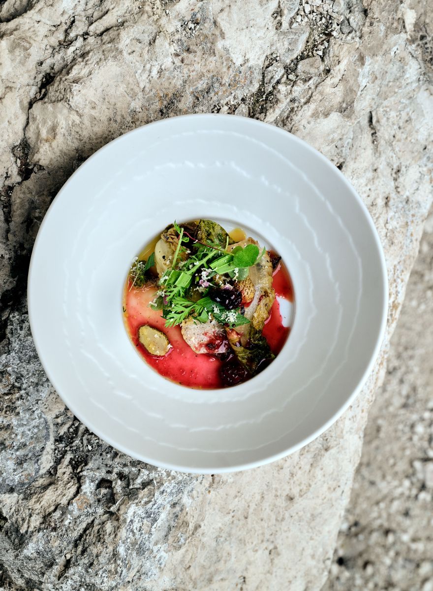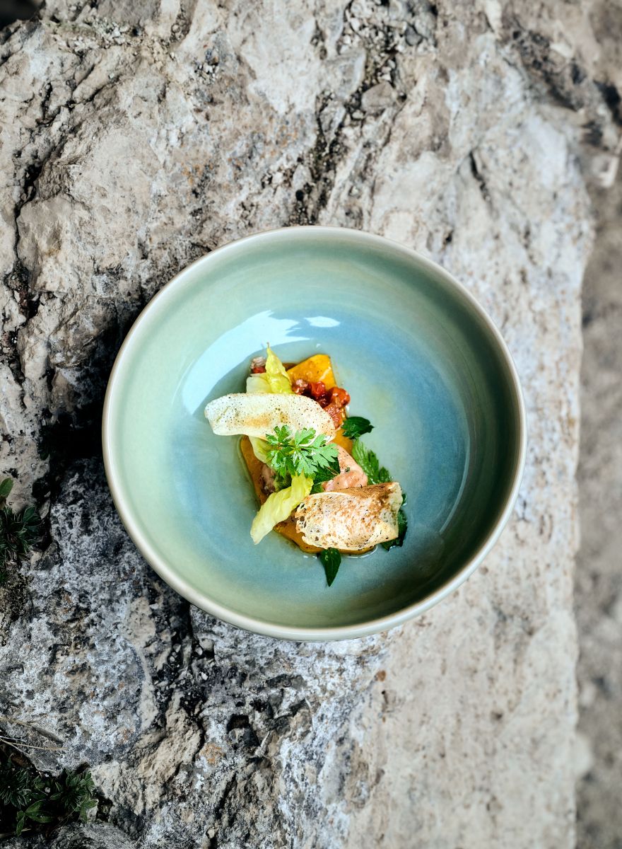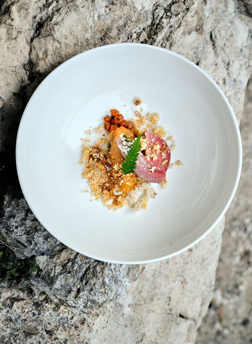 Im ersten Teller stand die Frische im Vordergrund: Auf dem offenen Feuer gegarter Hokkaido-Kürbis, mit Zitrone und Öl zu einem feinen, fast ingwerartigen Aroma verschmolzen, traf auf Lammbries, das in einer Marinade aus Limette und Kaffir-Limettenblättern zubereitet wurde. Dazu kamen ein Chutney aus Vogelbeeren, Wildkräuter und ein knuspriger Sauerteig-Brotchip mit Fichtennadeln und Fichtenspitzen.