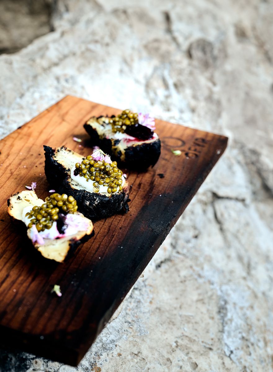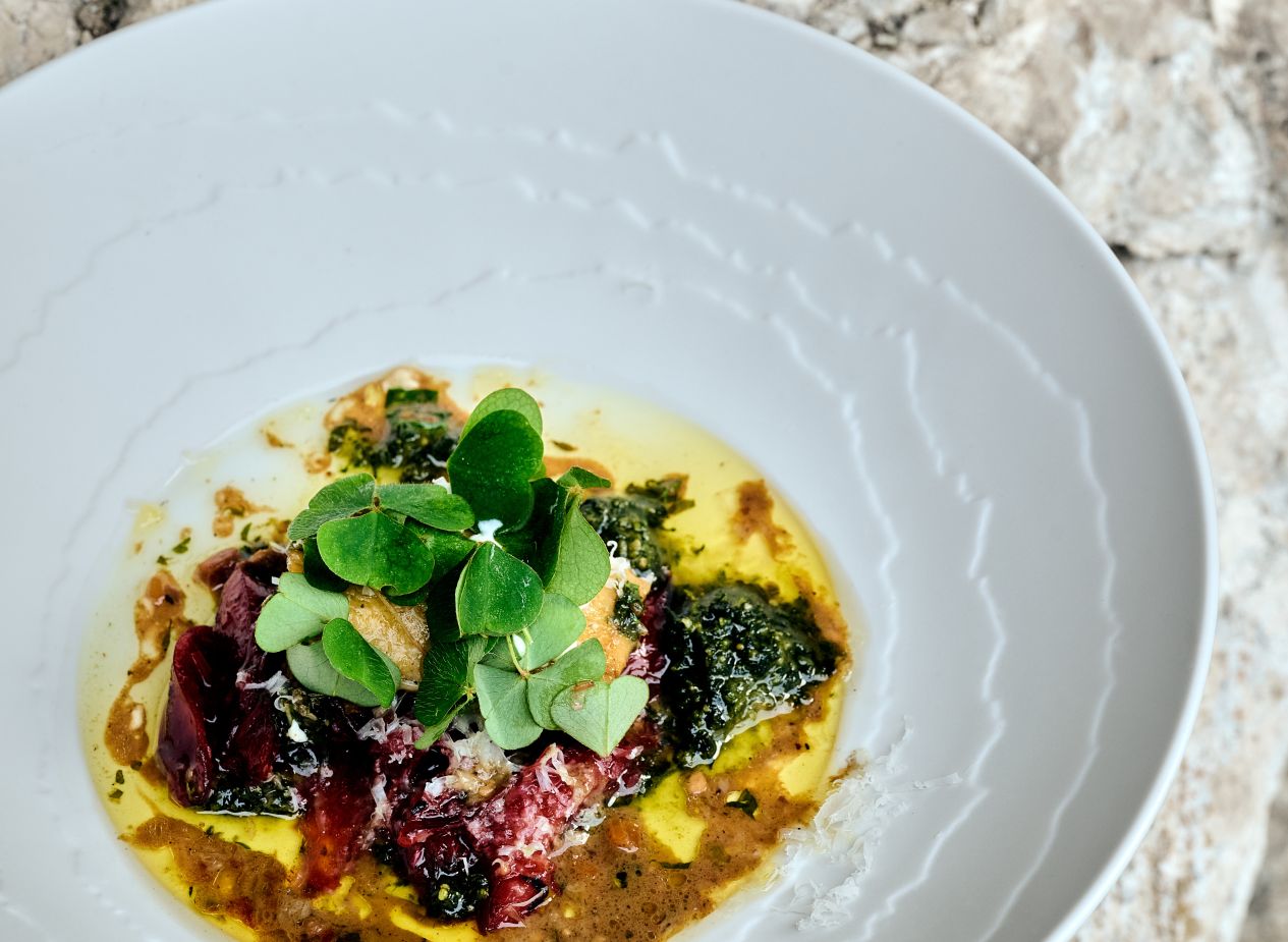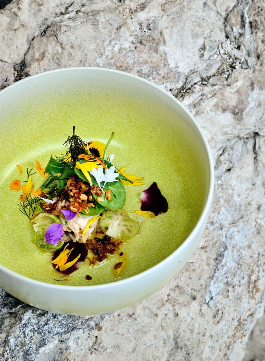 Im ersten Teller stand die Frische im Vordergrund: Auf dem offenen Feuer gegarter Hokkaido-Kürbis, mit Zitrone und Öl zu einem feinen, fast ingwerartigen Aroma verschmolzen, traf auf Lammbries, das in einer Marinade aus Limette und Kaffir-Limettenblättern zubereitet wurde. Dazu kamen ein Chutney aus Vogelbeeren, Wildkräuter und ein knuspriger Sauerteig-Brotchip mit Fichtennadeln und Fichtenspitzen.