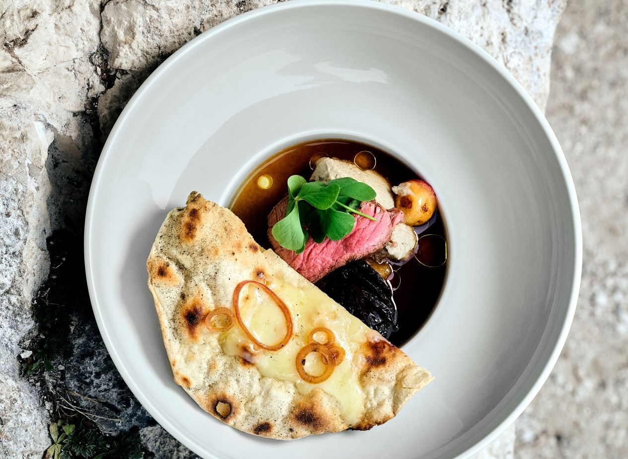 Im Mittelpunkt des dritten Gangs stand der Evelina-Apfel. Daniel Fehrenbacher und Hanna Reder interpretierten den Apfel in mehreren Texturen: als Apfelbutter, einem buttrig-sämigen Kompott, das mit seiner feinen Süße die Basis bildete, und als frische, fruchtige Note im Finish. Darüber lag ein cremiges Sellerie-Püree, zubereitet aus Knollen, die den ganzen Morgen über langsam in der Glut gegart wurden. Darauf türmte sich ein Ragout aus geschmorten Lammbäckchen, flankiert von kurz gebratener Lammhüfte. Eine in der Glut geschmorte und anschließend gegrillte Zwiebel setzte das aromatische Highlight, während ein knuspriger Flammkuchen mit Carré-Käse den Gang vollendete. Das Ergebnis: ein vielschichtiger, harmonischer Teller, der den Geschmack des Herbstes mit präzisem Handwerk vereinte.