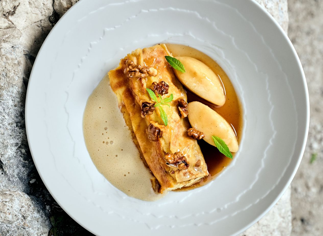 Zum Abschluss servierte das Team ASA Selection eine süße Hommage an das Handwerk: Topfen-Palatschinken mit Malzbirnen, karamellisierten Walnüssen und Vanillesauce. Für den Sud wurde Vorderwürze – ein Ansatz aus dem Bierbrauprozess – reduziert und als aromatische Basis genutzt, in der die Birnen langsam zogen und ihr feines Malzaroma entwickelten. Die größte Herausforderung lag im Kochen über offenem Feuer: die richtige Temperatur für den Teig des Palatschinkens zu finden und zu halten. Mit Geduld, Erfahrung und viel Fingerspitzengefühl gelang ein Dessert, das Klassik und Präzision vereinte.