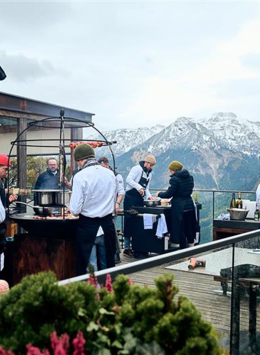 Am Montagmorgen brannten bereits die offenen Feuerstellen auf der Terrasse der Blauen Burg. Das offene Kochen verlangte den Teams alles ab: Organisation, Timing und echtes Handwerk. Die geladenen Tafelgäste durften den Teams über die Schulter schauen und konnten aus nächster Nähe miterleben, wie konzentriert und kreativ gearbeitet wurde. „So zu kochen, ganz reduziert auf das Wesentliche, hat etwas mit mir gemacht“, resümierte Eveline Wild. „Man bekommt ein neues Bewusstsein dafür, was wir im Alltag alles haben – und wie wertvoll jedes einzelne Produkt ist.“ Nach fünf Stunden voller Fokus und Teamarbeit präsentierten die Teilnehmenden schließlich ihre Teller.