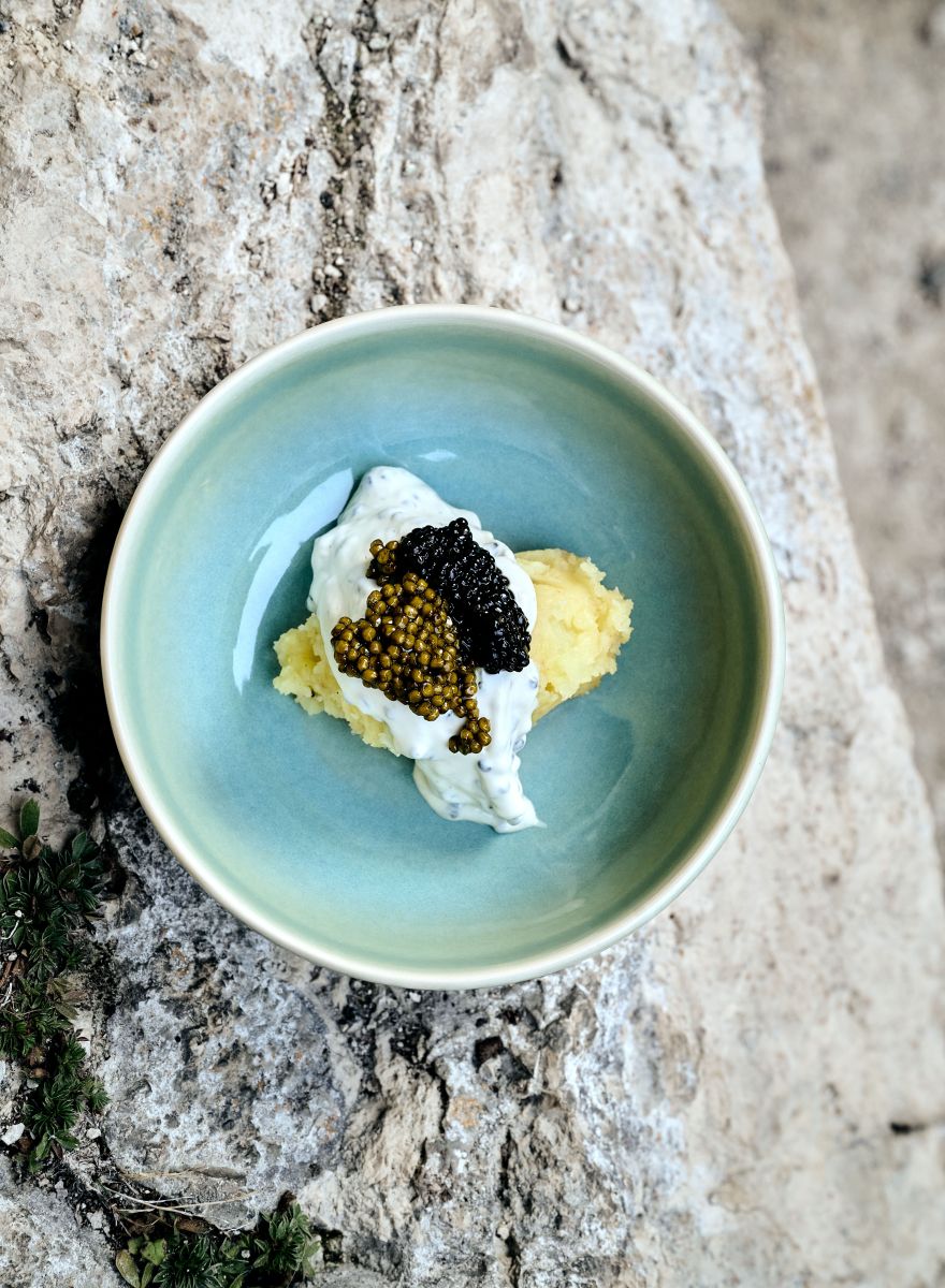 Die kreative Energie der Challenge Teilnehmenden erfasste schließlich auch den Vorstand der JRE-Deutschland, der ebenfalls vor Ort war. Präsident Oliver Röder („Burg Flamersheim“, Euskirchen) und Vize-Präsident Andreas Widmann („Widmann‘s Alb.leben“, Königsbronn-Zang) griffen spontan gemeinsam mit Genusslabor-Patron Tobias Bätz („AURA by Alexander Herrmann und Tobias Bätz“) zu Pfanne und Messer. Aus den übrig gebliebenen Zutaten kreierten die Jeunes zwei Zwischengänge – eine Forellen-Rillette mit Ceviche-Vinaigrette und eine rauchige Kartoffelpüree-Schmand-Kombination mit drei verschiedenen Kaviarsorten von AKI.