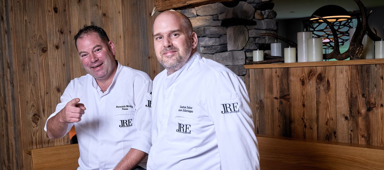70 Mitglieder der Jeunes Restaurateurs trafen sich im Goms. Es wurde eine lange, feuchtfröhliche Nacht. Family Affair mal zwei. Hängt an einem Gasthaus oder Hotel das elegante Schild mit den Buchstaben JRE, weiss der Gast, dass er ein besonderes Etablissement betritt: hier stehen junge, innovative und selbstständige Leute dahinter. Weltweit gehören 400 Restaurants mit 180 Michelin-Sternen, 4000 (!) GaultMillau-Punkten in 16 Ländern dazu, 6000 Mitarbeitende bewirten jährlich 5 Millionen Gäste. In der Schweiz zählen 35 Betriebe zur exklusiven Gemeinschaft. «Wir sind eine grosse Familie», bringt Präsident Denis Schmitt Sinn und Zweck der JRE auf den Punkt. «Wir teilen gemeinsam kulinarische Freuden, mit unseren Gästen und einmal jährlich wir untereinander an unserer Generalversammlung.» Diese findet jedes Jahr in einem Mitglied-Betrieb statt, der gross genug ist, die ganze «Familie» aufnehmen zu können. «Unser ‹Le Murenberg› in Bubendorf ist mit den rund 25 Plätzen leider zu klein», bedauert Präsident Denis Schmitt. Die JRE-Family pilgerte dieses Jahr ins Goms, in die «Tenne» von Familie Michlig. Grosses Bild oben: Fernando Michlig (l.), Gaston Zeiter.