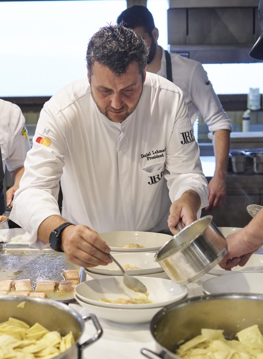 DER GAST AUS MAILAND. Gastgeber im Hotel Moosegg (16 Punkte) ist der 44-jährige Daniel Lehmann, der seit 2002 im früheren Betrieb seiner Eltern arbeitet und das Haus seit 2007 führt. Lehmann ist Präsident der JRE Europe und hat seinen Vizepräsidenten Daniel Canzian aus Mailand ins Emmental eingeladen: «Was uns verbindet, ist der immer wichtiger werdende Gedanken der Nachhaltigkeit. Wir achten die Region, kochen aber völlig unterschiedlich», sagt Lehmann. Für seine Kollegen hat er einen Schangnauer Hirschpfeffer mit Brotknödel, Rotkraut, eingelegter Melone und frisch gesammelten Pfifferlingen sowie Hexen-Röhrling zubereitet. Davor gibt es eine Brüggli-Saibling mit Meerrettich-Ravioli und Dill-Beurre-blanc.