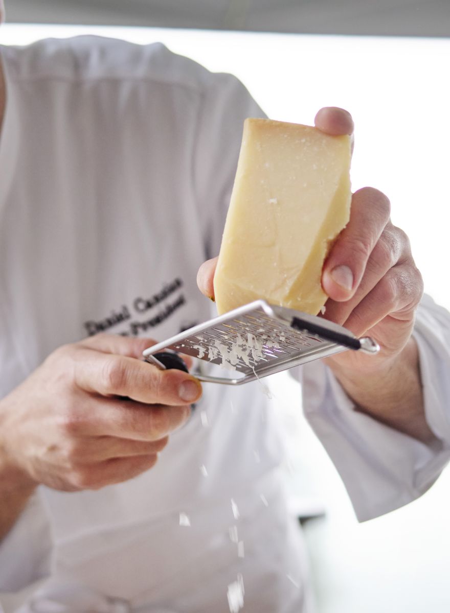 ITALIENISCHER KÄSE-TRICK. Daniel Canzian wiederum hat im Erdgeschoss des Hotels einen kleinen Stand aufgebaut und bereitet dort einfache Spaghetti mit einem erfrischend-grünem Pesto zu: «Das Geheimnis eines guten Pestos ist, dass man es sehr schnell mixt und sofort einfriert, dann bleibt es frisch», erklärt der Mailänder Koch. Und er verrät noch einen italienischen Käse-Trick: «Für die Sauce verwende ich 36 Monate alten Parmigiano Reggiano, weil er würziger ist. Frisch auf die Pasta aber kommt hingegen bloss 18 Monate alter Parmesan, der ist cremiger und schmilzt deshalb schneller auf dem Gericht.»