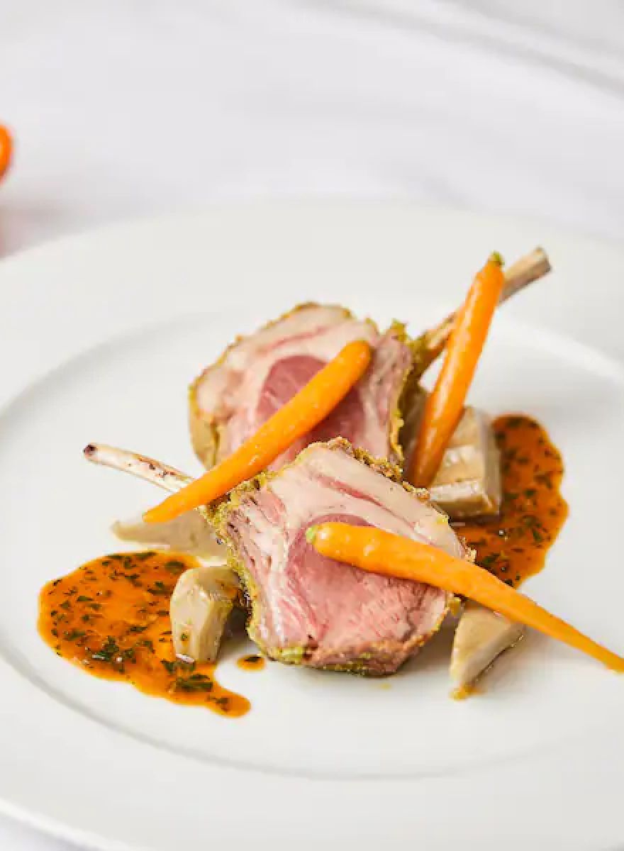 PAPRIKASUPPE & FENCHELSALAT. Das Amuse-gueule war uns nach der langen Anfahrt gerade recht: eine handfeste Mais-Galette unter Sauerrahm und Papayawürfelchen. Kräftig und herzerwärmend war auch die pikante Paprikasuppe mit eingelegtem Basilikum-Toast. Die marinierten, in feinem Fenchel-Salat kalt servierten Rückenfilet-Tranchen vom schottischen Label-Rouge-Lachs zählten wir zur raffinierten Seite des kulinarischen Angebotes, dies auch dank der aromatisch überzeugenden Zitronengras-Orangenvinaigrette mit Granatapfel-Kernen. Eher die rustikale Richtung vertrat darauf die Hauspastete vom Schwein, begleitet von sensationellen, eingelegten Gemüsestreifen.