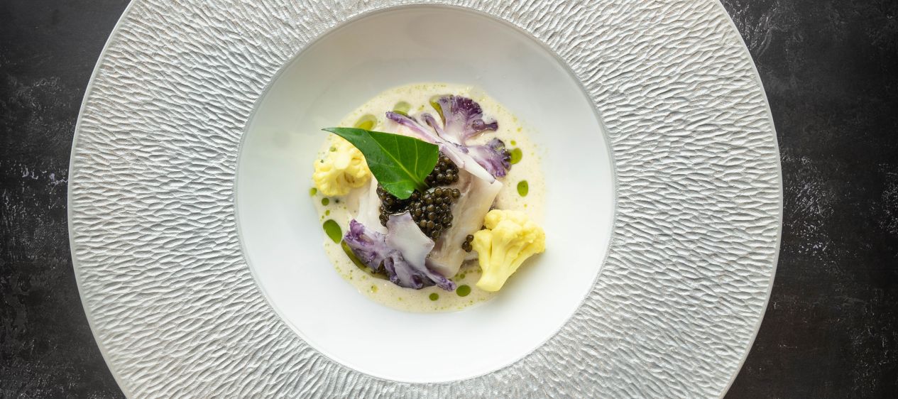 Garneer met de gemarineerde bloemkool en een canelle DOYY Caviar.