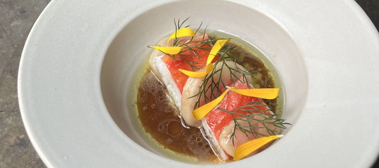 Das Krabbenfleisch großzügig mit Zitronenthymianöl bepinseln und bei 70 Grad im Ofen 3-4 Minuten temperieren. Mit etwas Maldon Sea Salt würzen.