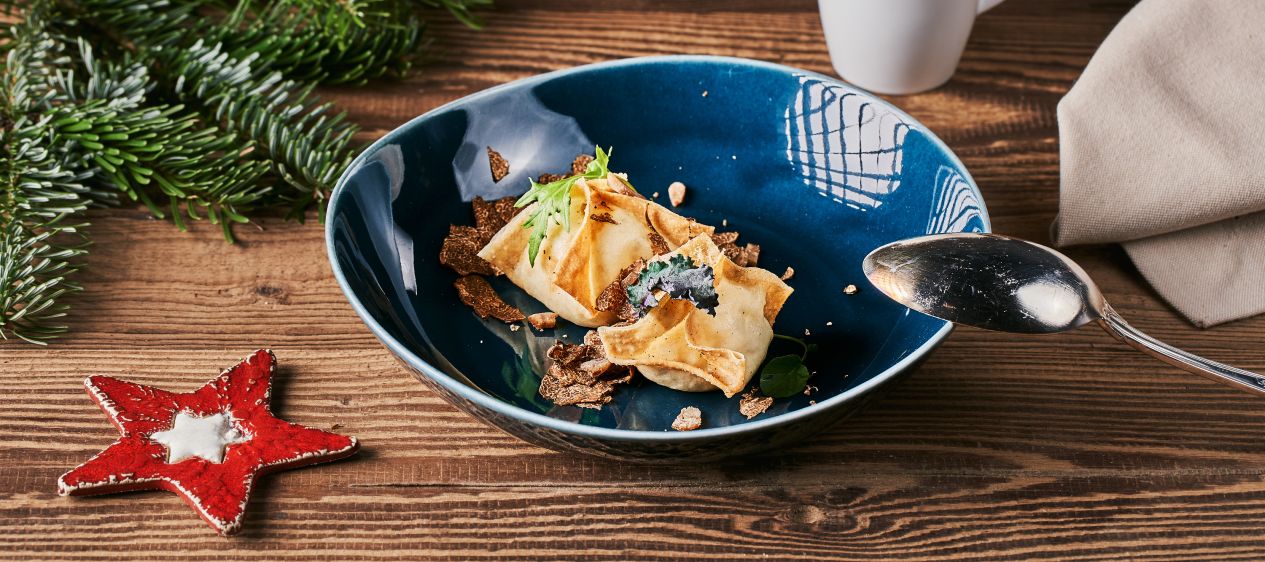 Schaumsuppe von Topinambur und Maronen, knusprige Ricotta-Ravioli, gehobelte Trüffel