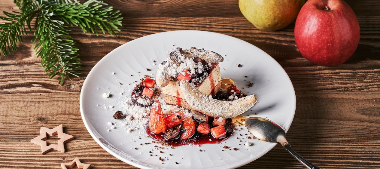Schnitte von Elisenlebkuchen und Bitterschokolade, Punschfrüchte, Tonka-Karamellsauce, Mandelcrumble