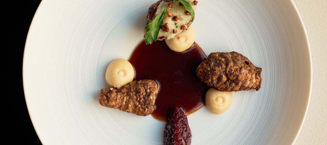 Zum Anrichten das Topinamburpüree nach Belieben auf den Teller geben und mit der frittierten Topinamburschale bestreuen. Eine Nocke von der Zwiebelmarmelade anlegen und den Röstgemüsesud in die Mitte des Tellers laufen lassen.