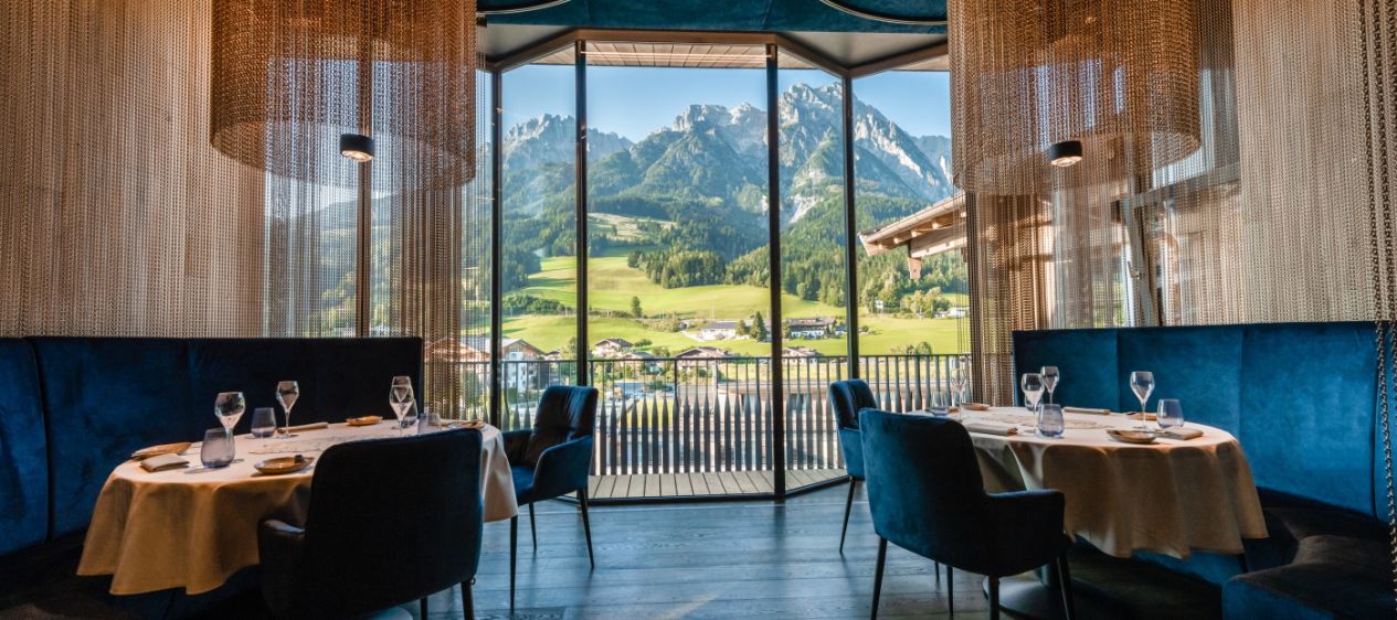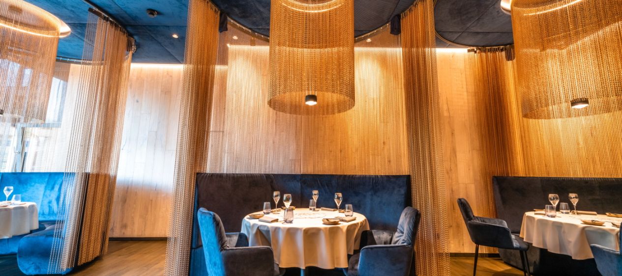 So sehr sich das Lokal mit seiner Glasfront zur Bergwelt hin öffnet, so intim und privat wirkt jeder der sechs runden Tische. Erst wenn der Gast Platz nimmt, öffnet sich der zarte Kettenvorhang, der jedes der kleinen Genuss-Separees umschließt. Eine speziell entwickelte Akustikdecke unterstreicht die sehr persönliche, ruhige Atmosphäre.