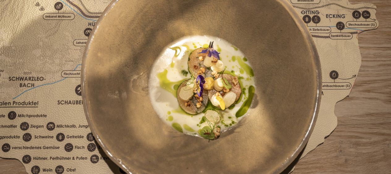 So kommen Gemüseraritäten vom Stechaubauern in der Nachbarschaft, Wild von befreundeten Jägern der Gemeindejagd, Lamm wird exklusiv beim Vorderrainerbauer gezüchtet, Rind bei anderen Leoganger Bauern. Bei Wildhühnern und Duroc-Schweinen gibt es ein gemeinsames Projekt mit dem Schattbachbauer, Forelle und Saibling kommen von den Leoganger Fischzüchtern Grundner und Hasenauer, der österreichische (!) Wolfsbarsch stammt von einem steirischen Biozüchter, die Enten aus Straden und sogar für Reis wurde mit Jakob Winter ein Jungbauer gefunden, der diesen nachhaltig in Niederösterreich (!) kultiviert, um nur einige Beispiele zu nennen. Gleiches gilt für Käse, Honig, Joghurts, Säfte und vieles mehr.