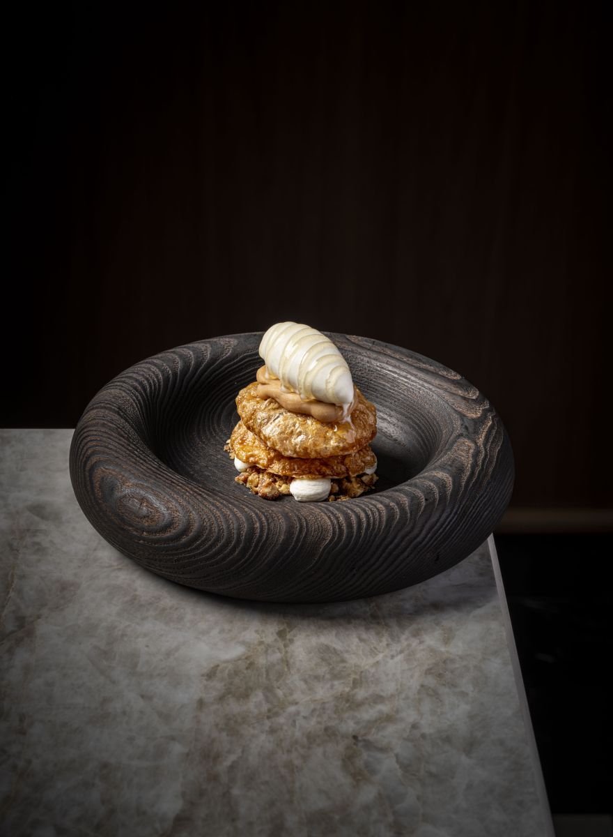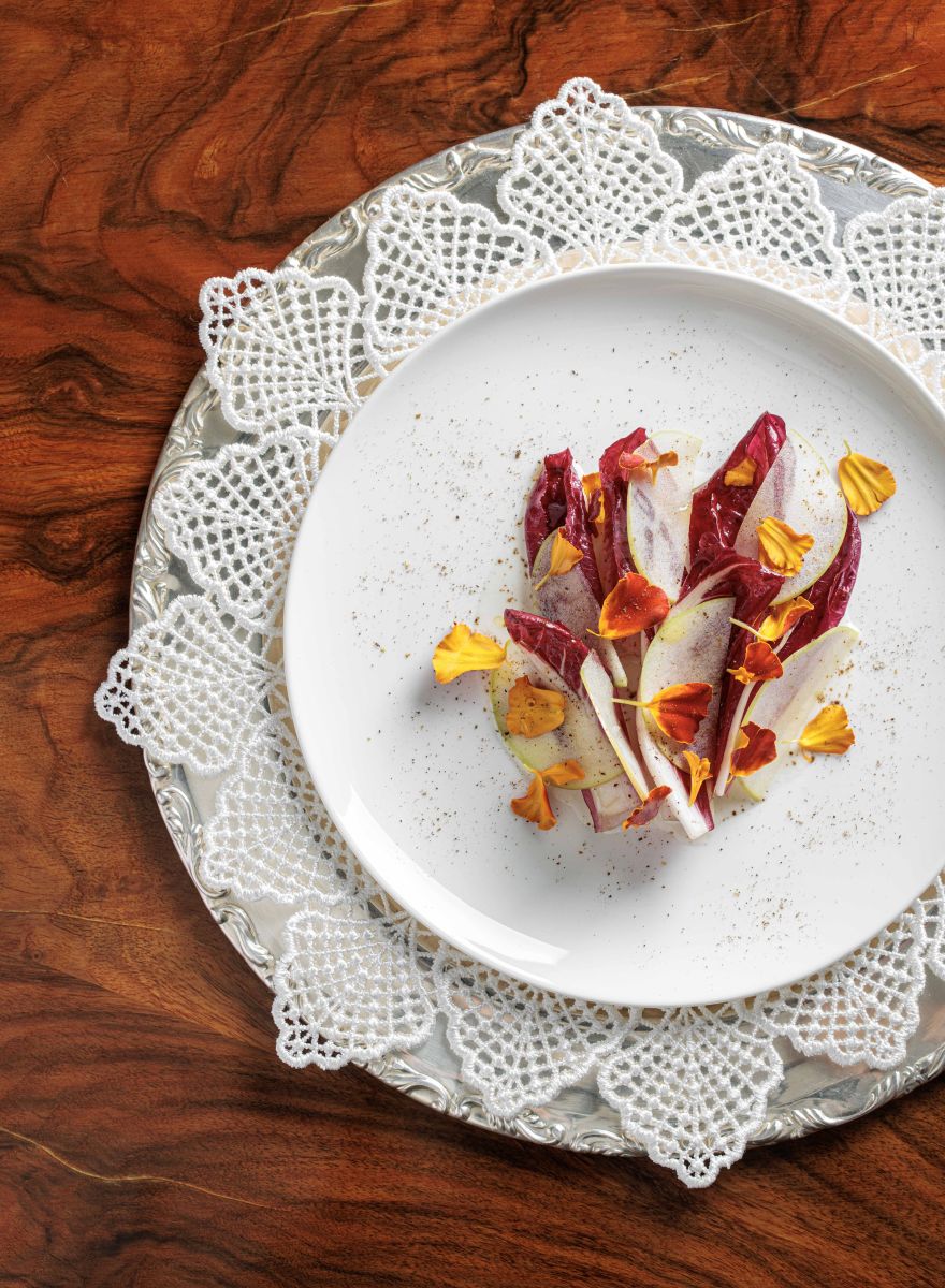 At the heart of the dish is red endive, whose gentle bitterness sets the tone for a layered interplay of flavours. Crisp green apple and citrus bring freshness, while a silky walnut and Mozzarella di Bufala sauce adds richness and depth. A walnut praline introduces subtle caramel notes and texture, and aromatic accents of orange blossom water and Timut pepper provide lift. The result is a composed salad that moves between freshness and creaminess, tension and harmony, delivering clarity in every bite.