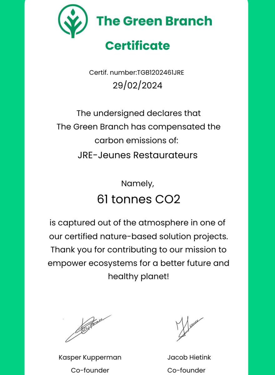 The Green Branch has compensated 61 tonnes CO2 carbon emissions of JRE-Jeunes Restaurateurs, specifically for the Congress.