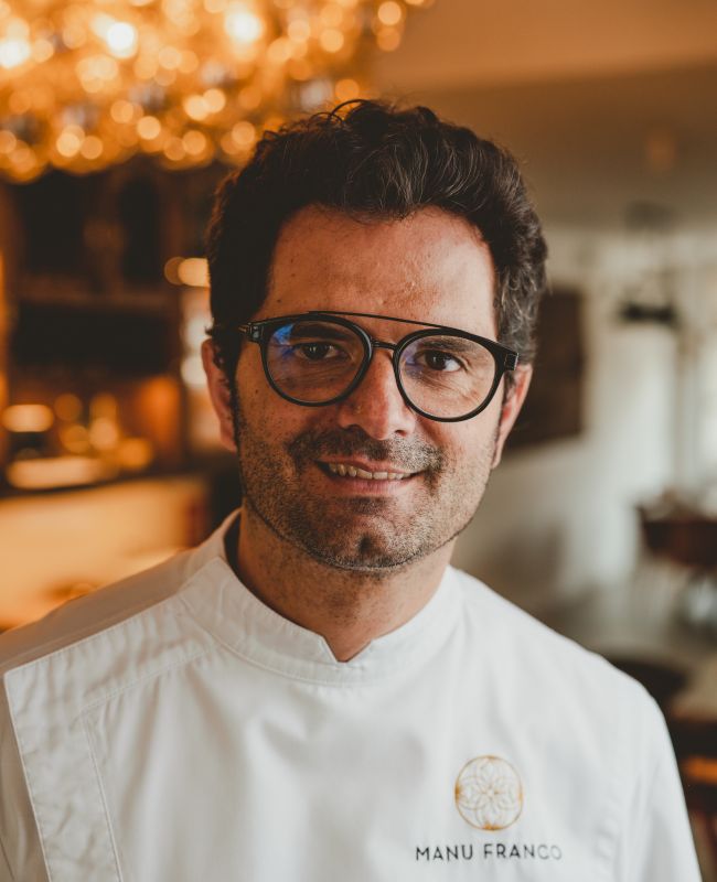 Before he was a chef, Manu Franco spent 20 years telling stories as a journalist. But the pull of Valdemorillo—and the words of his father—brought him back to the family restaurant. After training at Le Cordon Bleu, he reimagined Casa Manolo as a fine-dining destination, earning a Michelin star in just five years. His approach is personal and intuitive, shaped by the landscape and the belief that food should evoke emotion.