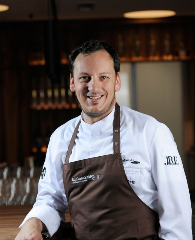 Schlosskeller’s chef, Markus Rath, learned his cooking skills from working at the finest restaurants, like Taubenkobel in Burgenland and Kreuzwirt at Gut Pössnitzberg, Styria.  Formerly working at restaurant Rathhaus on Längsee (Carinthia), he now showcases his love of local farm products at restaurant Schlosskeller Südsteiermark.