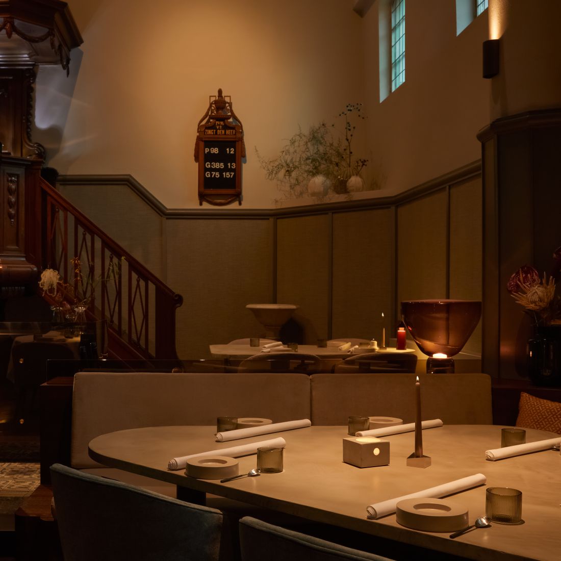 G7 sits in the 1634 Gruizenkerkje in the heart of Sittard, a restored monument where contemporary dining meets centuries of history. The restaurant spans the old church and the adjoining 1593 timber-framed house, creating an intimate space shaped by soft light, flowing curtains and warm materials. Guests choose a menu of eight, ten or fourteen creations, revealed only through a hint of ingredients to keep the experience fresh and surprising. Much of the produce comes from G7’s own vegetable garden in Montfort and the pluktuin beside the restaurant, supported by local growers who share their respect for origin.