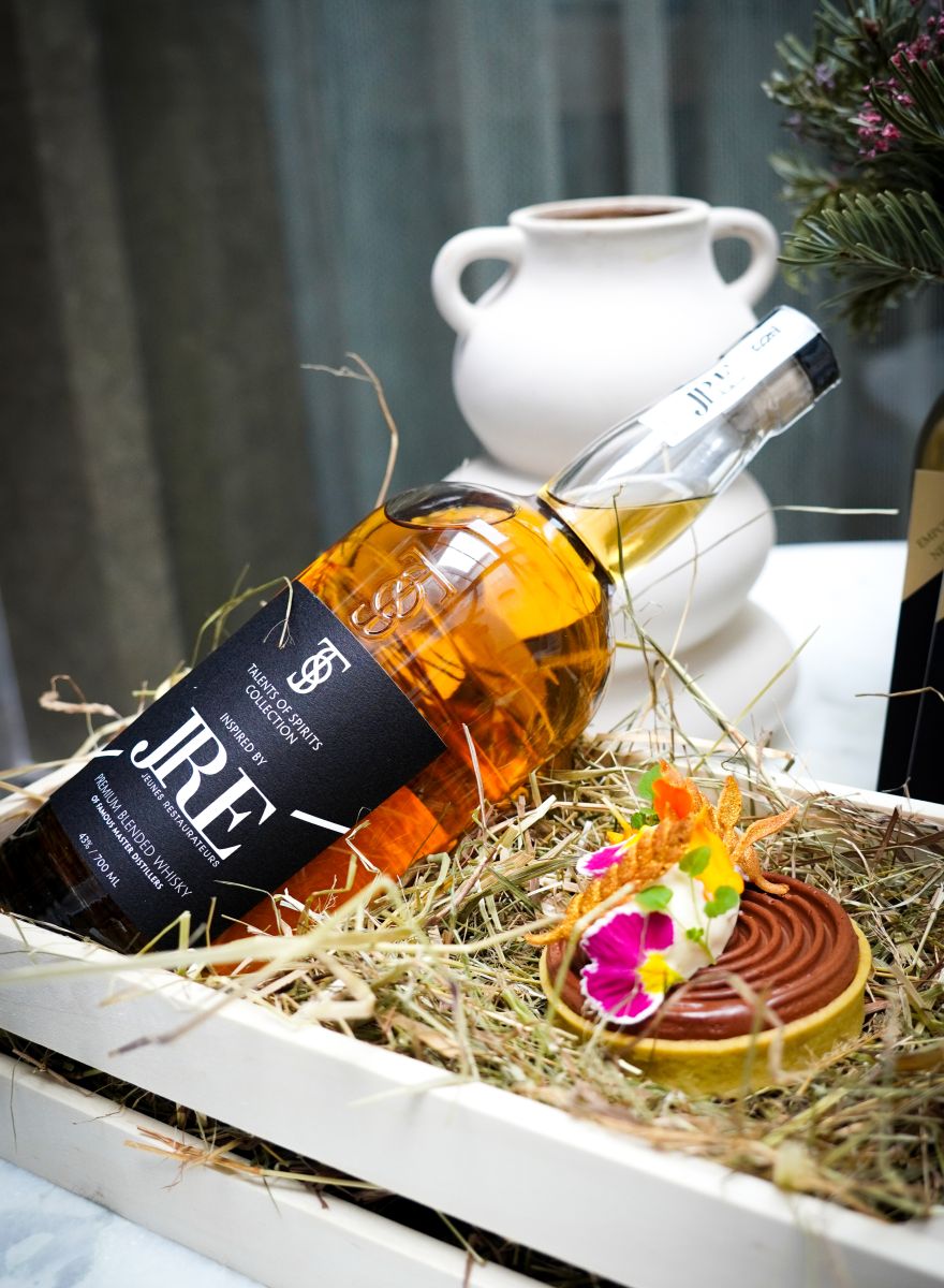 Guaviare dark chocolate 65% and Whiskey inspired by JRE unfold in a smooth ganache, set atop a crisp tart base with salted butter caramel. Finished with a quenelle of hay-infused ice cream, this dessert brings together intensity, freshness, and quiet elegance. It's a true invitation to explore flavor.