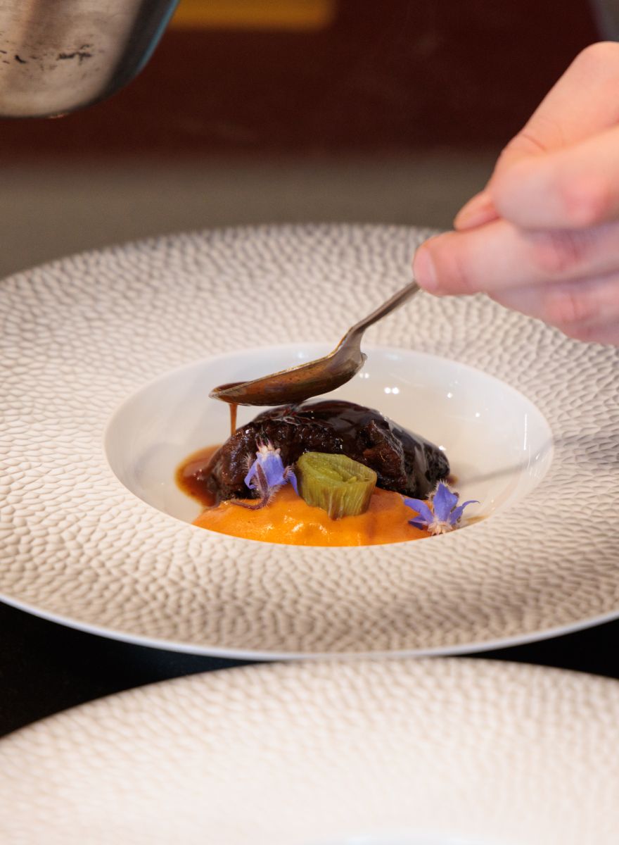 For the main course, we tasted black Slavonian pork confit with smoked leeks, black Slavonian pig kulen cream, and slow-cooked black Slavonian pig cheek.