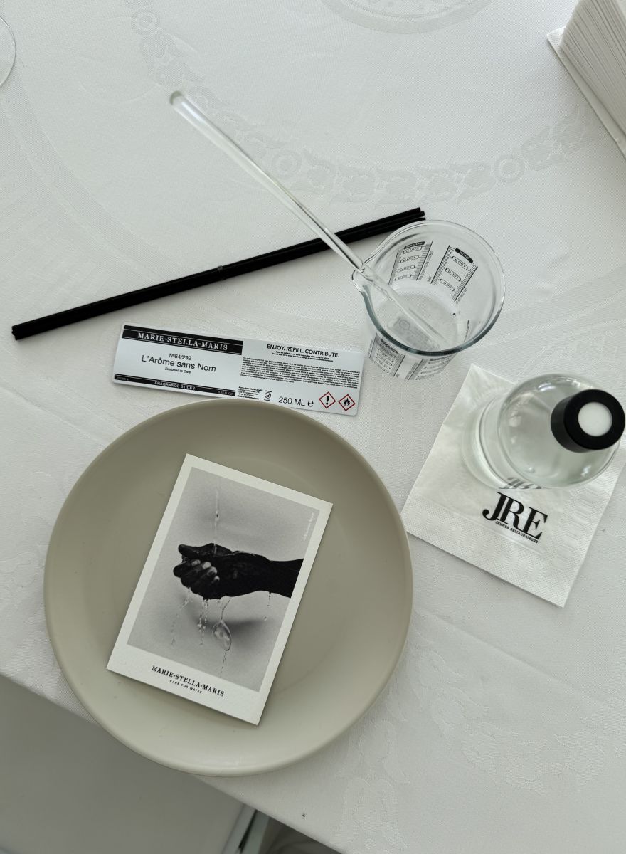 The session started with an introduction to their philosophy, after which guests explored a collection of scents using fragrance strips. Each participant selected their favourites, narrowed them down to three, and began blending — carefully adding drops into an alcohol base, testing, and adjusting along the way. When satisfied, they bottled their own unique creation and personalised it with a special JRE event logo.