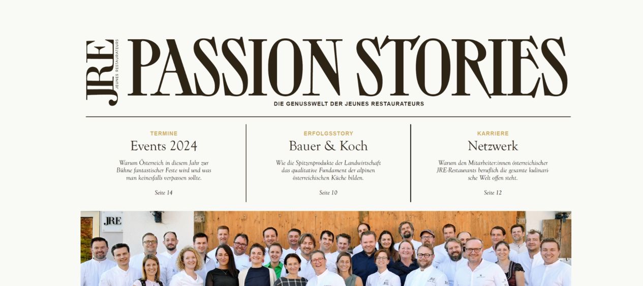 PASSION STORIES highlights the world of JRE-Jeunes Restaurateurs' top chefs They are widely acclaimed as the trendsetters of Austrian gastronomy and celebrate their 20th anniversary in 2024. In honor of the anniversary year, this elite association of top Austrian chefs is featured in a newspaper of its own.