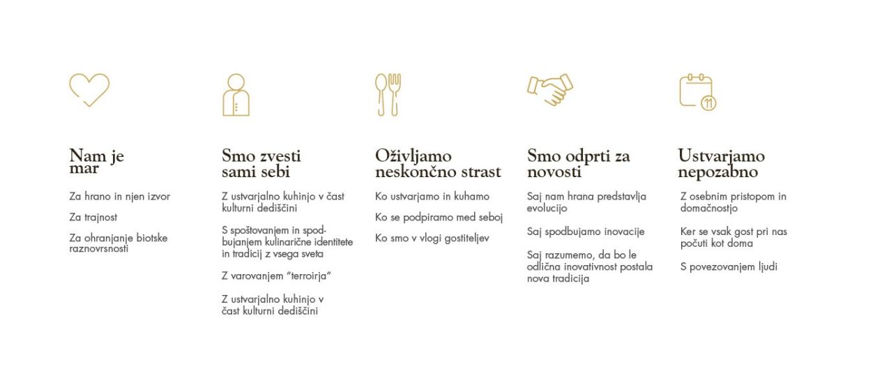 Člane JRE združenja prepoznamo po nadpovprečnemu talentu in strasti do gastronomije, ki jo potrjujejo z izborom vrhunskih lokalnih sestavin in proizvodov, ustvarjalnosto chefov in skrbjo za ohranjanje tradicije. Ob tem so restavracije JRE posebne zaradi svojih lokacij, interierja, vzdušja in storitve. V JRE zdrženju se vse vrti okrog ustvarjalnosti, deljenja in spodbujanje talenta in strasti do hrane. Naši člani z veseljem izmenjujejo svoje kuharsko in strokovno znanje. Gostje v JRE restavracijah boste brez dvoma okusili najboljše kar ponuja kolektivna strast do gastronomije.