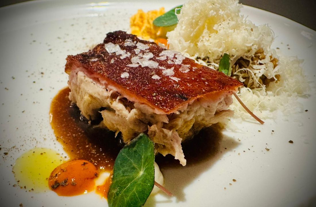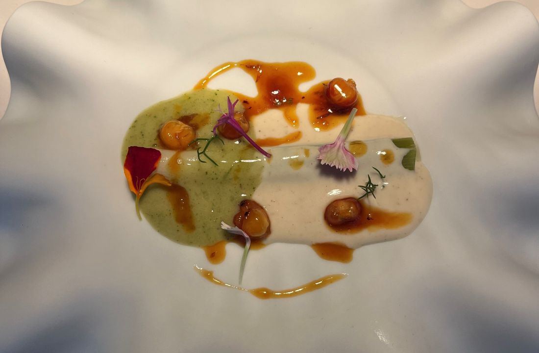 Seared sea bass with lobster ravioli, artichoke puree and lobster sauce