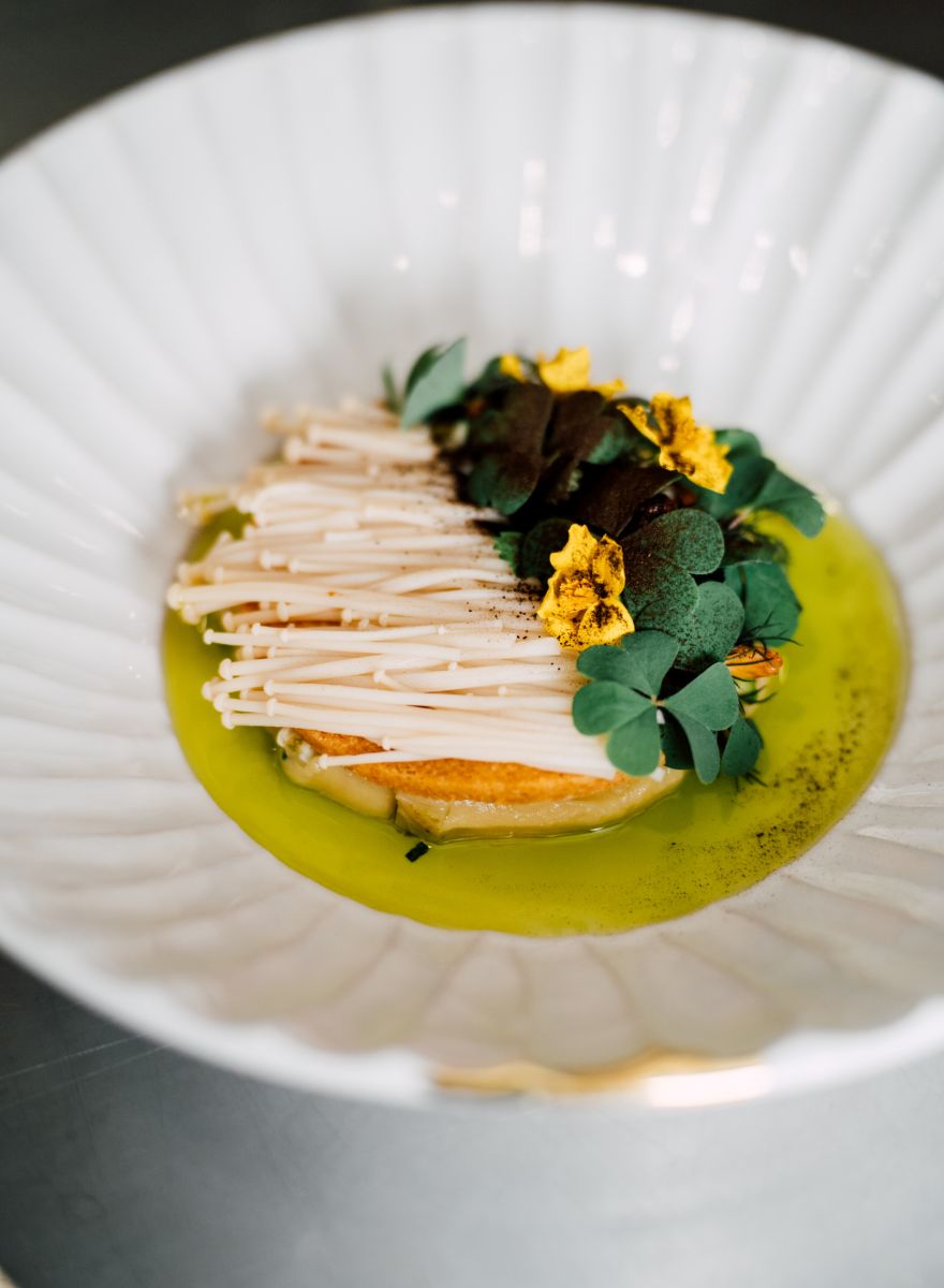 When all the individual parts of the recipe are prepared, it's time to finalize the dish. First, the aligot is arranged in the center of the plate using a plating ring. Depending on the season and taste, the aligot can also be topped with blanched and butter-sautéed artichoke hearts and chanterelles. On top of this, the salty shortcrust pastry is placed. Then, the pickled enoki mushrooms are draped over one half of the shortcrust pastry – on the other half, the dish can be decorated with seasonal herbs or flowers and seasoned with a herb oil.