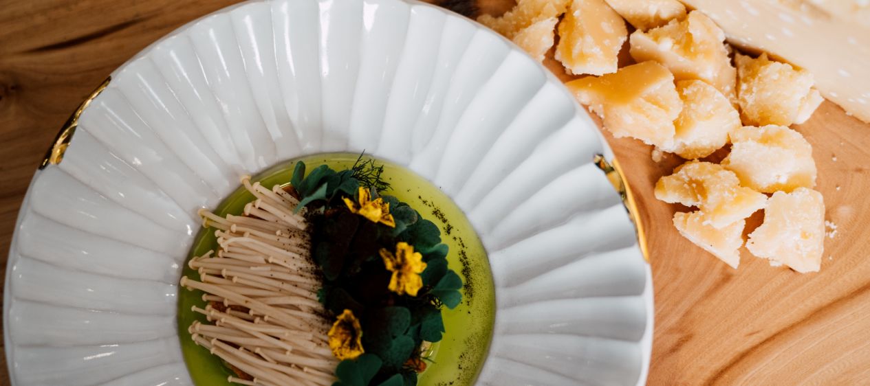 Looking to impress your dinner guests? Try this Aligot with Parmigiano Reggiano, salty shortcrust pastry and pickled enoki mushrooms! This recipe created by JRE Chef Philipp Dyczek from Restaurant Artis for Parmigiano Reggiano, this recipe showcases the rich flavours of Parmigiano Reggiano and the vibrant tang of pickled enoki mushrooms.