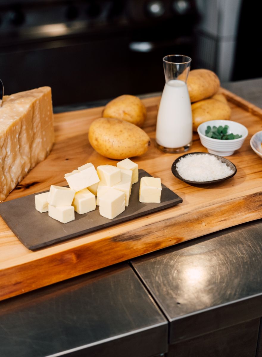 Boil the potatoes in the water until soft, let them evaporate and strain through a fine sieve. Then put it in a mixer and alternately add brown butter and milk. Finally, put the finished mashed potatoes in a pot and slowly incorporate the Parmesan while stirring constantly, then season with salt and nutmeg.