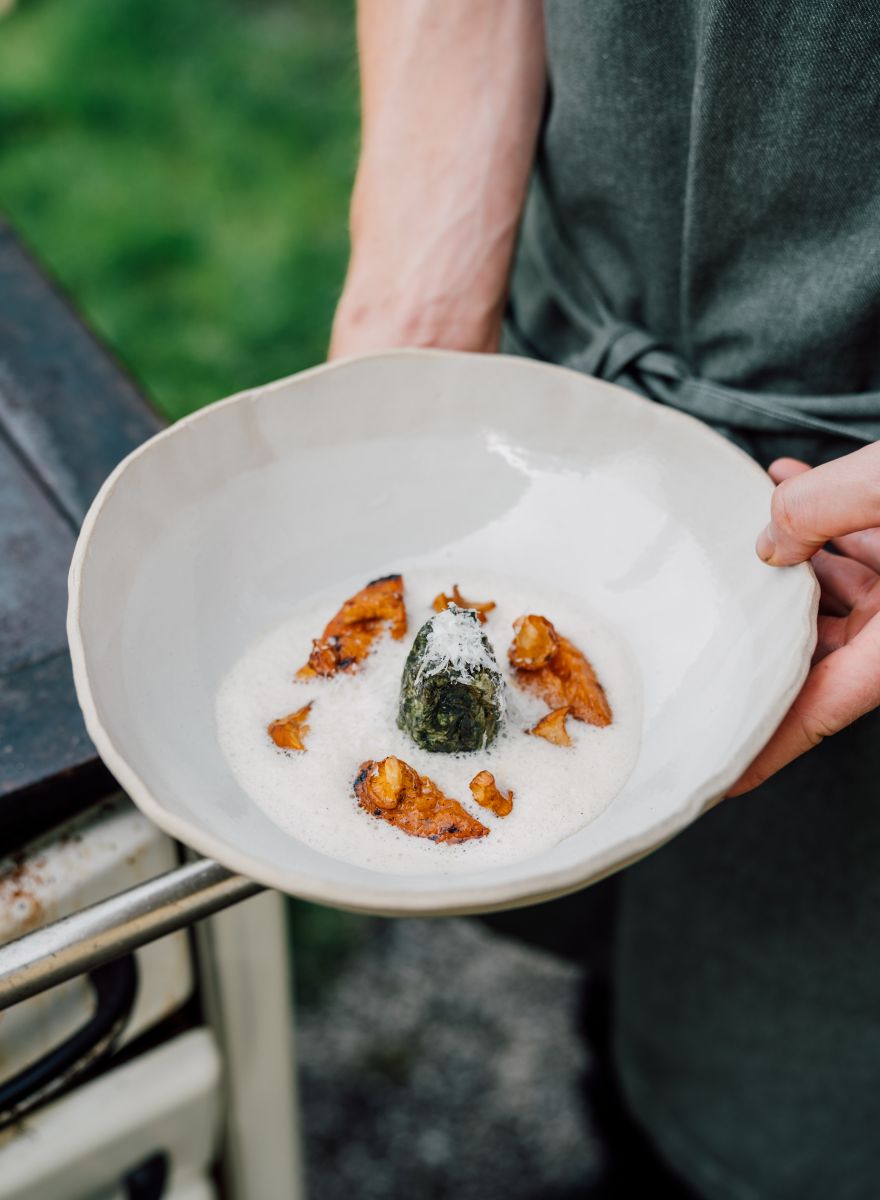 To serve, place the lettuce hearts in the middle of a deep plate and froth the yeast foam with a hand blender. Place chanterelles and apricots around the lettuce heart.