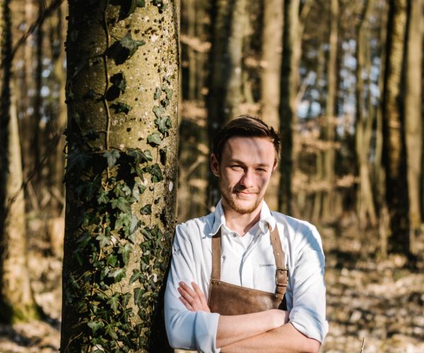 • To serve, place the lettuce hearts in the middle of a deep plate and froth the yeast foam with a hand blender. Place chanterelles and apricots around the lettuce heart.