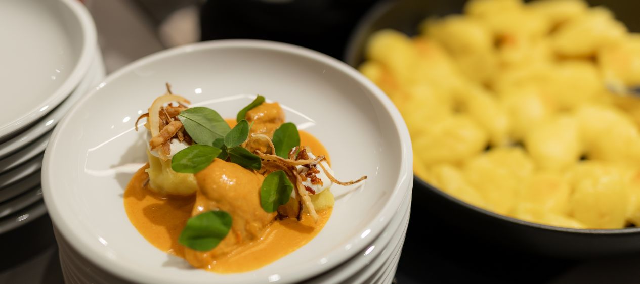 This hearty and comforting dish is a typical specialty from Prekmurje, the northeastern region of Slovenia known for its rich culinary heritage and Hungarian influences. Dödöli, a simple yet satisfying potato-and-flour dish, is often served with a variety of toppings—from sour cream and fried onions to cracklings. It's most delicious when paired with a flavorful chicken paprikash, a stew infused with sweet paprika and slow-cooked to perfection. This classic combination showcases the warmth and simplicity of traditional Prekmurje cuisine.