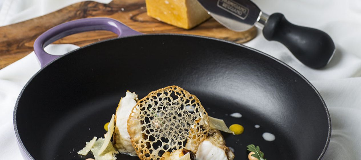 You put the fish hot in a beautiful dish. Then you put the sauce with the oyster mayonnaise and to finish you cover the monkfish with the Parmigiano Reggiano coral-tuile. Garnish with slices of Parmigiano Reggiano.