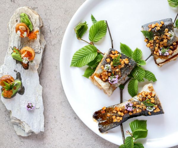 Start by mixing water and sugar in a heated pan until you see very light caramel starting to form. Pour this out on both types of vinegar and reduce it by 50%. Then sauté the vegetables and garlic with olive oil until colourless. Add vegetables, mineral water, mustard seeds, laurel leaves, orange zest, and peppercorns to the vinegar reduction and reduce to 1/3. Place all herbs on top and let it simmer for 15 minutes without heat. Then pass the brew through a cloth and heat it again. Add the saffron threads, and season with salt. Finally, thicken the brew with a little xanthan gum until it is perfectly smooth.