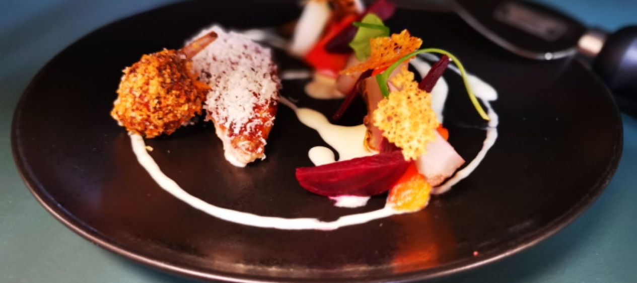 Cut the vegetables and arrange them on the plate. Grate the fillets of the Parmigiano Reggiano until covered and place on the plate. Roll the thighs in the lacquer, then in the grilled Parmigiano Reggiano powder and place on the plate. Gently pour in the Parmigiano Reggiano Cream.