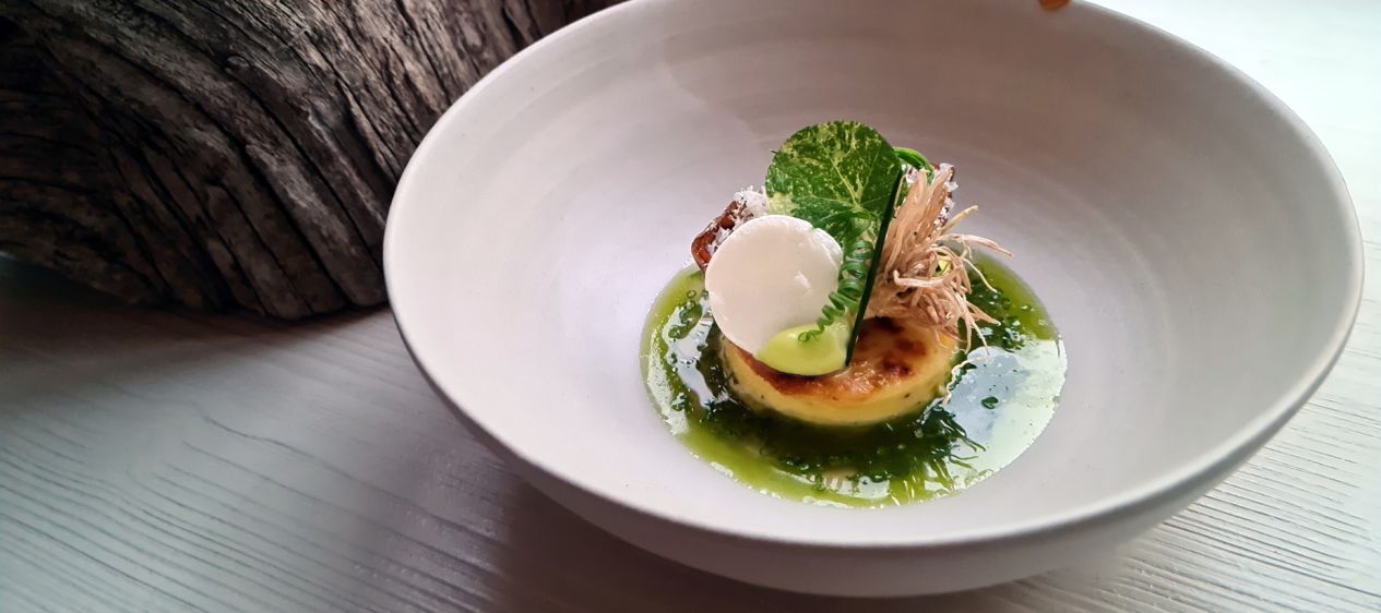 Place the Flan in the middle of a bowl, put the crispy potato skin on top. Top with a lot of Parmigiano Reggiano, leek mayonnaise, chives, herbs, spring onion and the sour cream discs. Pour the sauce over the dish at serving time.